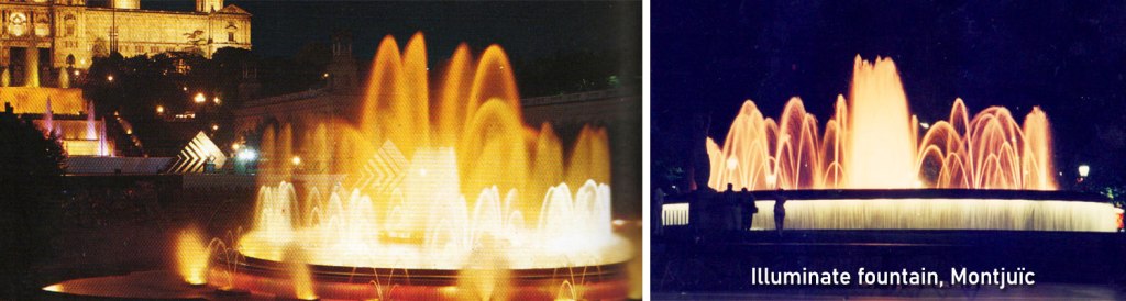 มองจาก Montjuïc ย้อนกลับไปจะเห็น Torres Venecianas (Venecian Tower) กับ Monumental Fountain ตรงกลาง Plaça d’Espanya