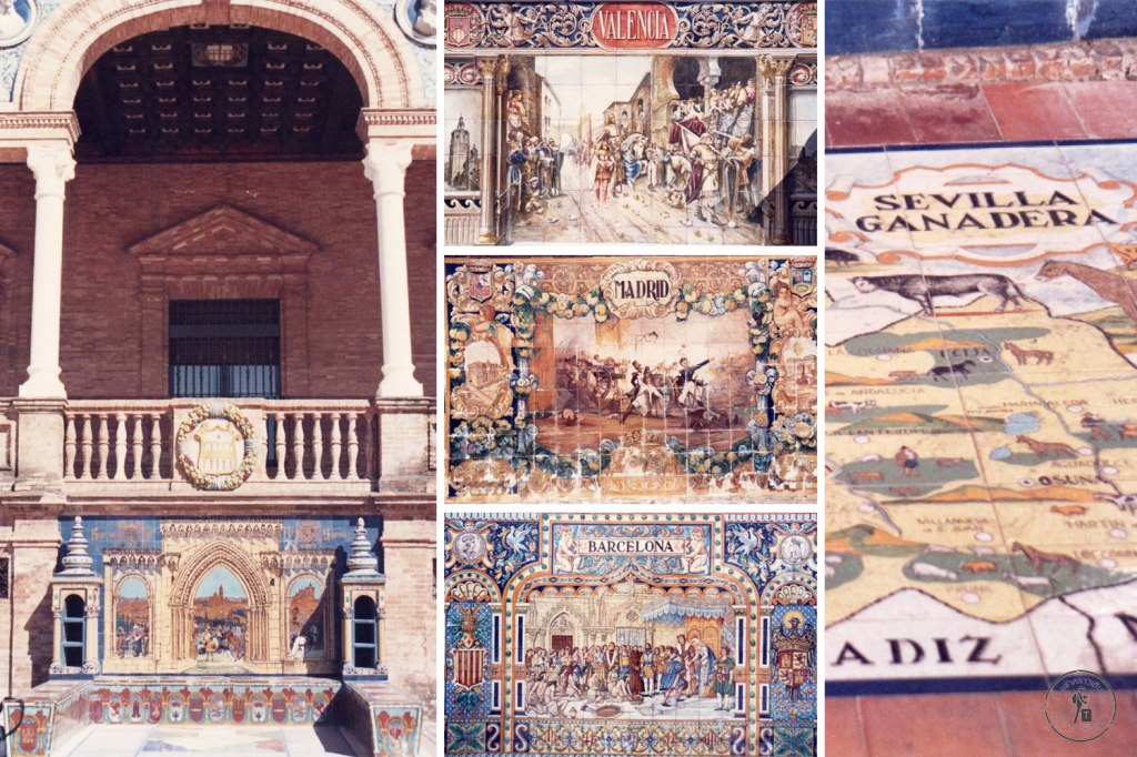 กิจกรรมยอดนิยมบริเวณนี้คือนั่งรถม้าเที่ยวเล่น แต่พวกเราไม่ได้นั่ง เดินเล่นก็เพลินแล้ว นอกจากอาคารสวยๆ ก็มีกระเบื้องวาดรูปลงสีเป็นรายละเอียดเมืองต่างๆ อยู่ตลอดแนวอาคาร เราเลือกถ่ายรูปมาเฉพาะเมืองที่เราได้ไปเที่ยวคราวนี้ ซึ่งน้อยมาก ต้องไปเที่ยวสเปนอีกครั้งนะ
