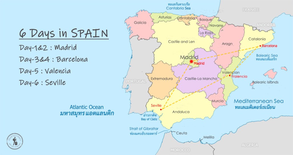 ถ้าจะให้เที่ยวสเปนได้ทั่วทุกแคว้น เลือกแค่แคว้นละ 1 เมืองก็ต้องใช้เวลาเกือบ 20 วัน และความจริงใน 1 วันก็เที่ยว 1 เมืองได้ไม่ทั่ว การไปเที่ยวสเปนในเวลาจำกัดจึงต้องเลือกแคว้นเลือกเมือง ซึ่งเราเลือกทำความรู้จักกับ มาดริด เมืองหลวงของสเปน และ บาร์เซโลน่า เมืองหลวงของแคว้นคาตาโลเนีย เป็นหลัก แถมด้วย บาเลนเซีย และ เซบีญ่า