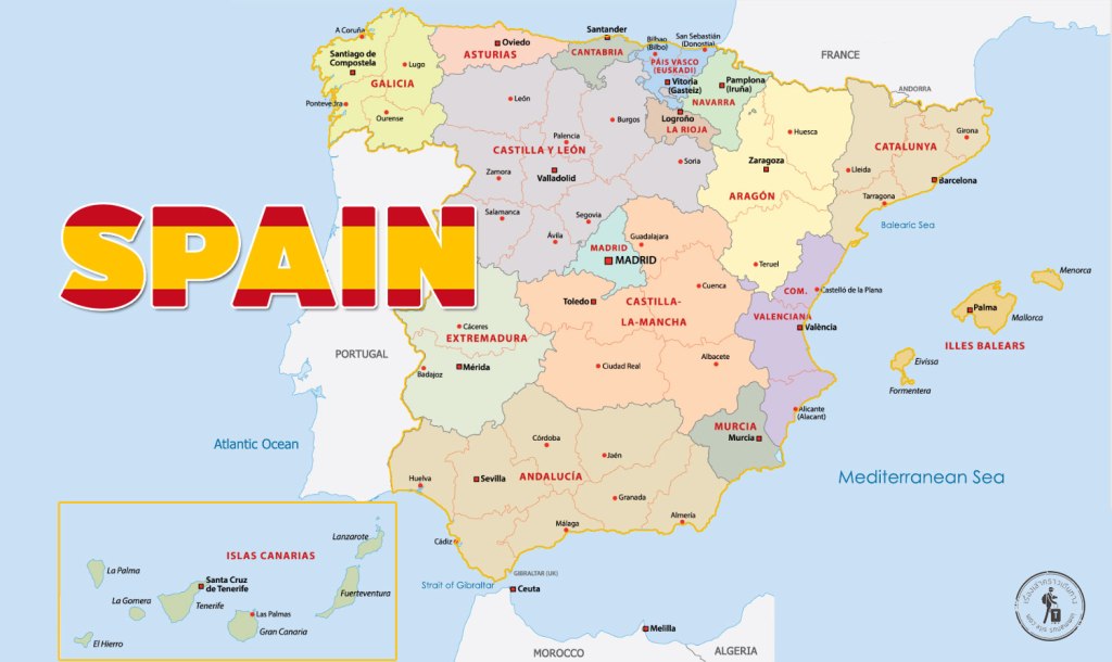 สเปน | Spain | España ประเทศที่อยู่ปลายติ่งของทวีปยุโรป ด้านบนติดประเทศฝรั่งเศสกับประเทศอันดอร่า ฝั่งซ้ายทิศตะวันตกติดโปรตุเกส และมีแนวชายฝั่งติดมหาสมุทรแอตแลนติกและทะเลกันตาเบรียด้วย ส่วนทิศตะวันออกเป็นชายฝั่งติดทะเลเมดิเตอร์เรเนียนยาวถึงช่องแคบยิบรอลตาร์ สเปนเคยเป็นมหาอำนาจทะเล มีกองเรืออันยิ่งใหญ่เกรียงไกร และเคยมีเมืองในอาณานิคมมากมาย ที่คุ้นเคยสุดๆคือ ฟิลิปปินส์ ที่เคยเป็นประเทศในอาณานิคมของสเปนมายาวนานเพิ่งได้เอกราชไปเมื่อปี พ.ศ. 2489 (ค.ศ. 1946) นี่เอง นักเดินเรือที่น่าจะพอคุ้นหูจากความรู้สมัยเด็กๆ คือ คริสโตเฟอร์ โคลัมบัส ผู้ค้นพบแผ่นดินอเมริกานั่นไง