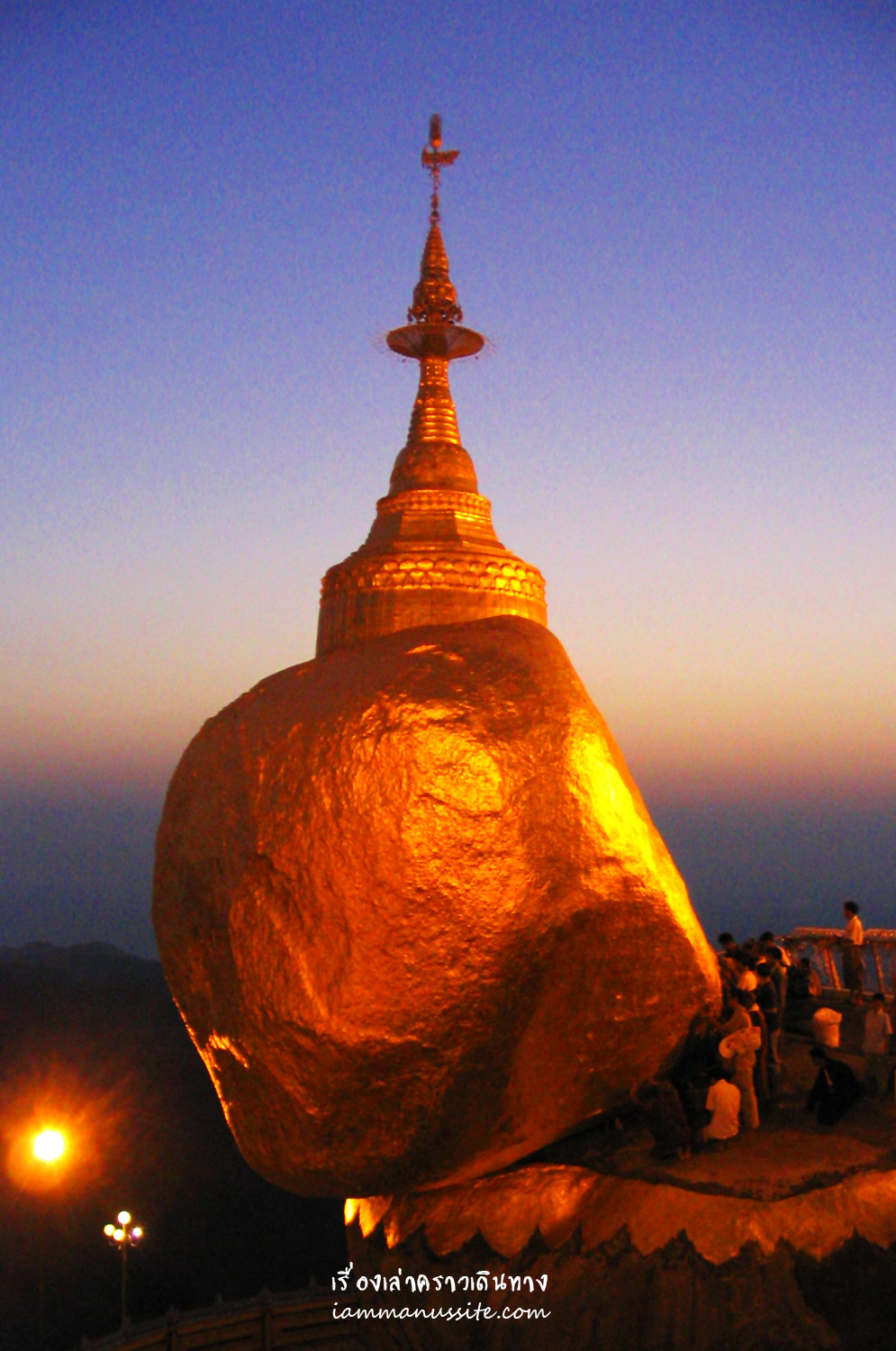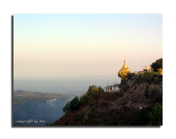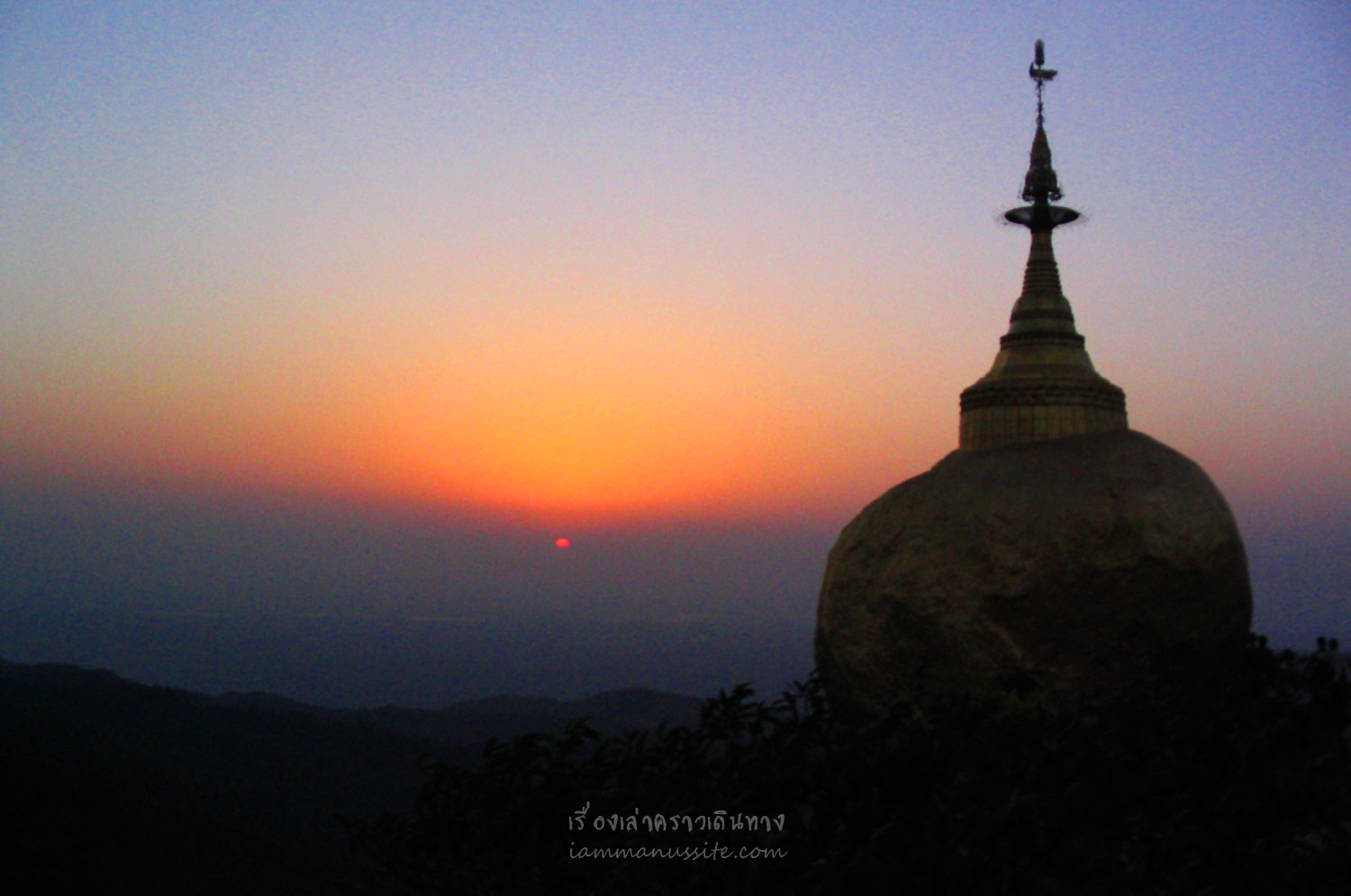 กว่าจะแบกกันขึ้นมาถึงด้านบนก็บ่ายแก่ เข้าที่พักซึ่งมีให้เลือกอยู่แค่ 2-3 ที่ อยู่ติดกับวัดเลย โรงแรมที่ทัวร์จองมาถือว่าดีที่สุดแล้ว แต่คุณภาพไม่ต่างกับโรงแรมจิ้งหรีด ที่นอนหมอนผ้าห่ม เห็นแล้วขนลุก แต่ก็นอนแค่คืนเดียว ทนๆเอา เก็บของแล้วก็เดินเข้าไปนมัสการพระธาตุกันตามอัธยาศรัย อย่าลืมว่าการเข้าพื้นวัดในประเทศพม่าต้องถอดรองเท้าเดินเสมอ เตรียมถุงไปหิ้วด้วยก็ดี หรือใครใคร่ถอดวางไว้หน้าประตูไม่กลัวหายก็ได้ ถุงเท้าก็ต้องถอด ต้องเดินเท้าเปล่าเท่านั้น