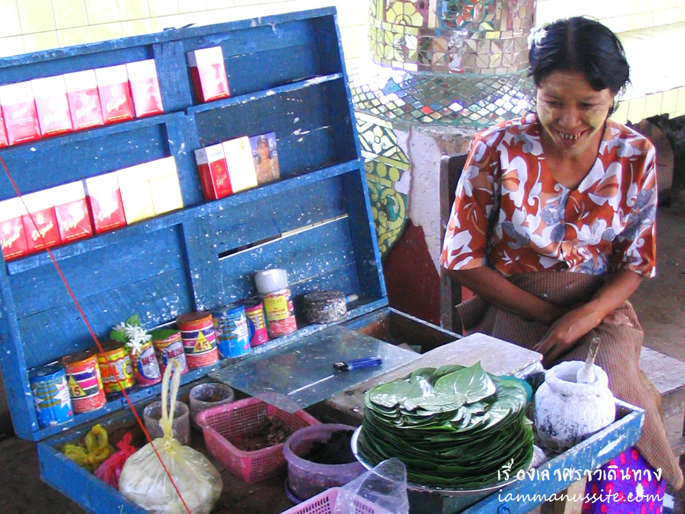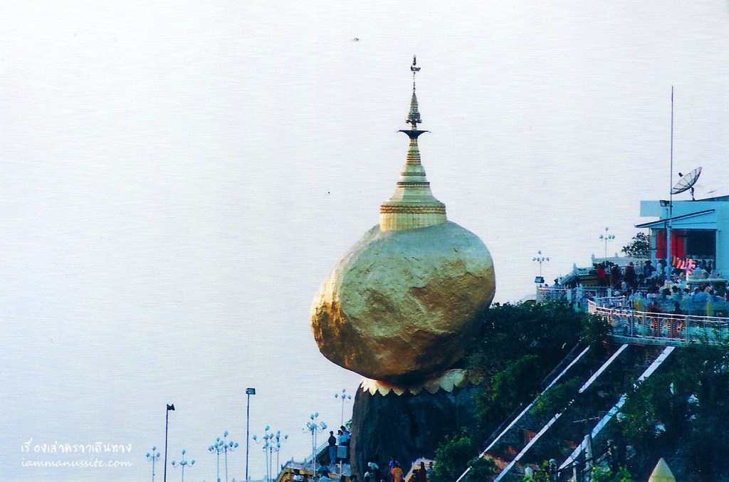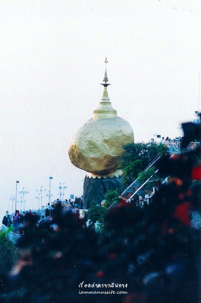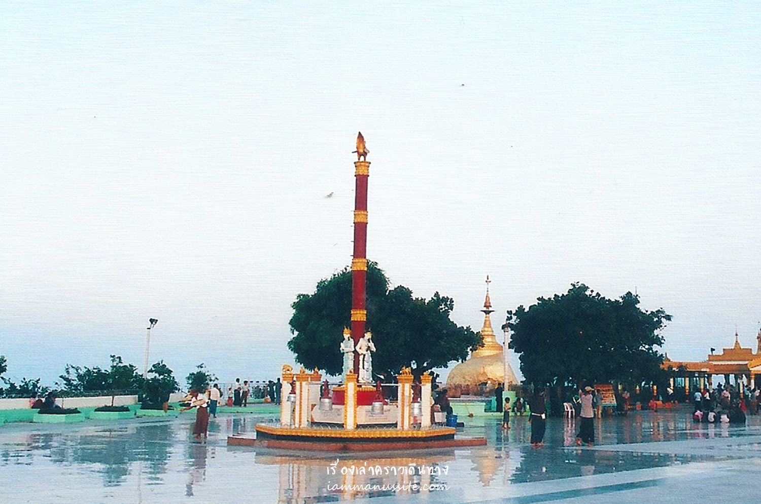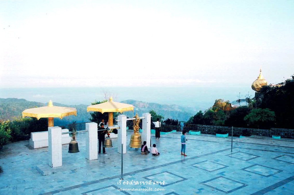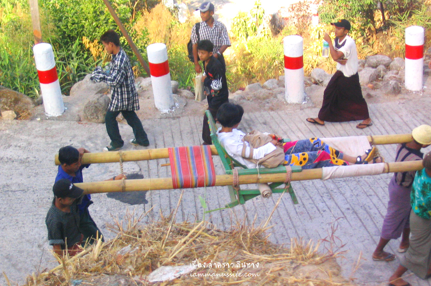 พวกเราเปลี่ยนรถเป็นหกล้อเล็ก นั่งวนขึ้นเขามาถึงจุดจอด จุดที่เริ่มเดินต่อขึ้นไปที่ยอดเขา ซึ่งทัวร์มีจัดเสลี่ยงให้เรานั่งขึ้นไป (เหมือนขึ้นภูกระดึงบ้านเราเลย) ความจริงเดินก็พอไหวไม่ได้ไกลมาก แถมทุกคนบอกว่าเดินขึ้นได้บุญนัก แต่เมื่อทัวร์จัดเสลี่ยงให้ เราก็เลยขอลองนั่งหน่อย เสลี่ยงนั่งแบบมีคนแบกหาม 4 คน ประหนึ่งองค์หญิง เพียงแต่ที่นั่งเป็นแค่เก้าอี้มัดติดกับลำไม่ไผ่ ไม่ได้เป็นเกี้ยวแบบองค์หญิงในหนังจีน พลหาบจะเดินแบกเราก้าวฉับๆขึ้นเขาวนไปวนมา บางช่วงเป็นบันได ขอบอกว่าเสียวไม่น้อย แถมด้วยกลิ่นเหงื่อสาบกายชายพม่าตลบอบอวลสุดๆ เป็นประสบการณ์ครั้งหนึ่งจริงๆ (ต่อมา พม่าพัฒนาการเดินทางขึ้นถึงองค์พระธาตุ โดยทำถนนให้รถ 4WD ขึ้นไปได้สะดวก จนปัจจุบันมีเคเบิ้ลคาร์แล้ว ขึ้นลงได้ง่ายขึ้นไปอีก แต่สงสัยว่าแล้วจะเหลือบุญเท่าไหร่กัน ฮา…)