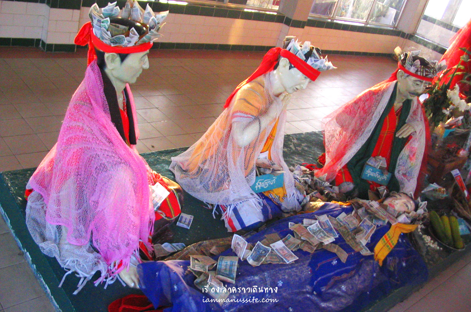 เข้าไปในอาคารดูรูปปั้นของ“พระนางชเวนันจิน”ในท่านอนหงาย มีตำนานเล่าว่านางเป็นลูกครึ่งของคนกับพญานาค โตมาเป็นสาวสวยได้แต่งงานกับเจ้าเมือง ต่อมาป่วยหนักโหรบอกว่าก่อนแต่งงานนางไม่ได้เคารพบรรพบุรุษ จึงให้เดินทางไปกราบพระธาตุอินทร์แขวน แต่โดนเสือกัดตายเสียก่อน เลยกลายเป็นนัตอยู่ที่บนเขานี้ (คนพม่าเรียกผีแบบนี้ว่า นัต แต่นัตไม่ใช่วิญญานทั่วไป นัตเป็นกึ่งผีกึ่งเทพ คือศักดิ์สูงกว่าผีแต่ยังไม่ใช่เทวดา คนตายที่วิญญานจะกลายเป็นนัตต้องเป็นคนที่มีคนเคารพนับถือ เมื่อตายไปโดยเหตุภัยอันน่าสะเทือนใจ ผู้คนรู้สึกสงสารเห็นใจเลยกลายไปเป็นนัต ชาวพม่าบูชานัตเพื่อให้ช่วยปกป้องดูแล คุ้มครองป้องกันภัย)