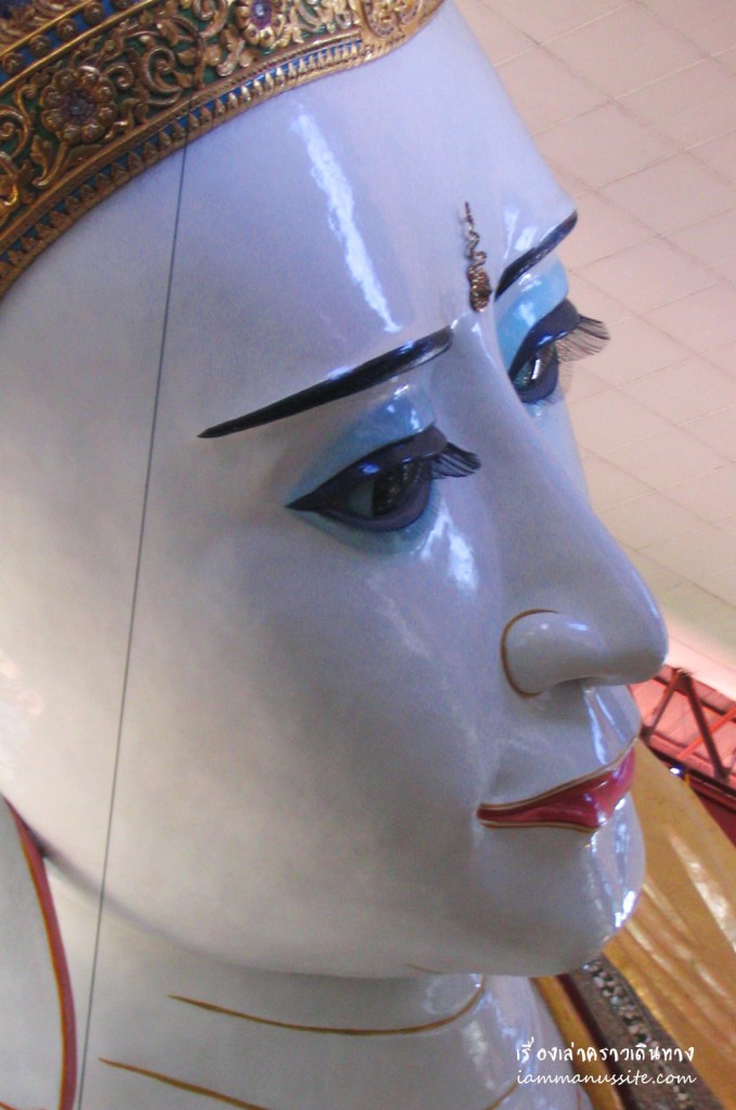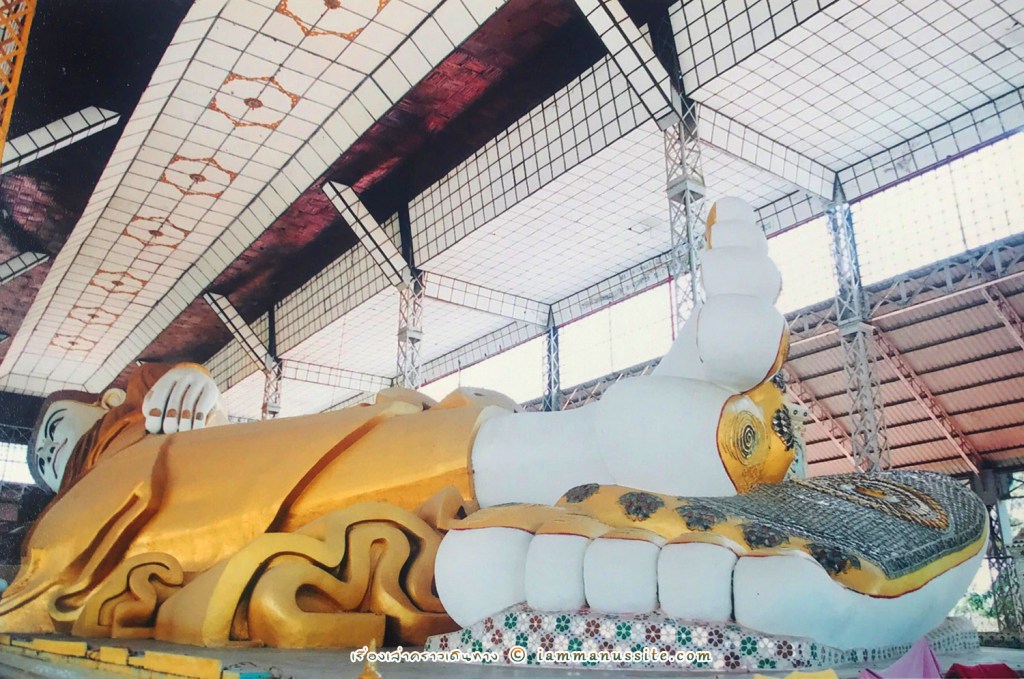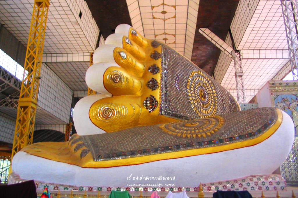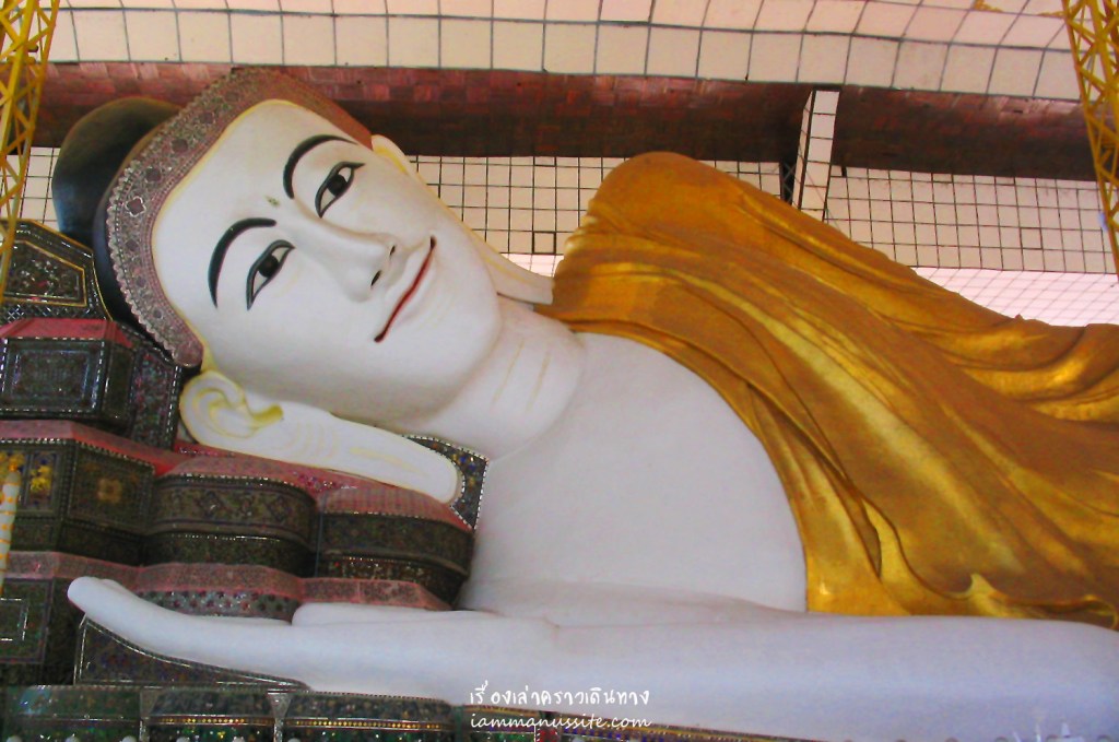 พระพุทธรูปองค์นี้นอนยิ้มหวาน บางคนก็เลยเรียกพระยิ้มหวาน มีที่หนุนหัวเหมือนหมอนขิตบ้านเราเลย จีวรก็ทำได้ดูพริ้วไหวเหมือนจริง เดินวนไปดูฝ่าเท้ามีการประดับตกแต่งด้วยกระจกสวยงาม สังเกตดูนิ้วเท้าพระพุทธรูปพม่าจะยาวไม่เท่ากันเหมือนเท้าคนจริงๆ แต่พระพุทธรูปไทยนิ้วจะเท่ากันหมด ไปหาสังเกตุดูได้