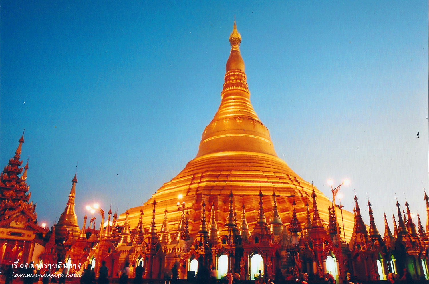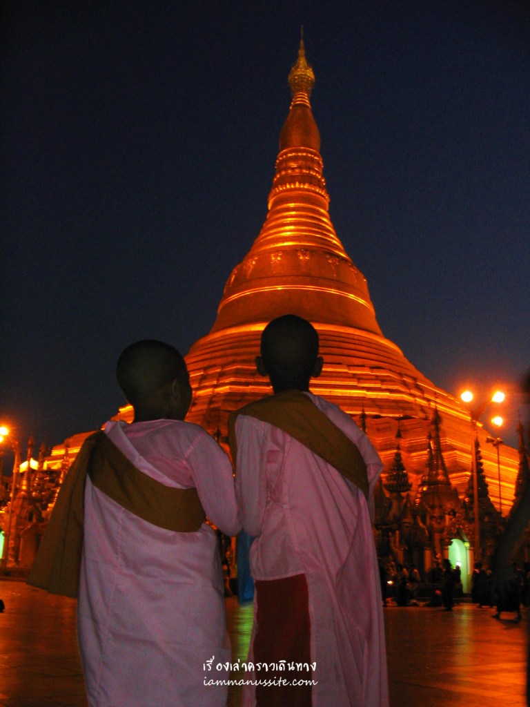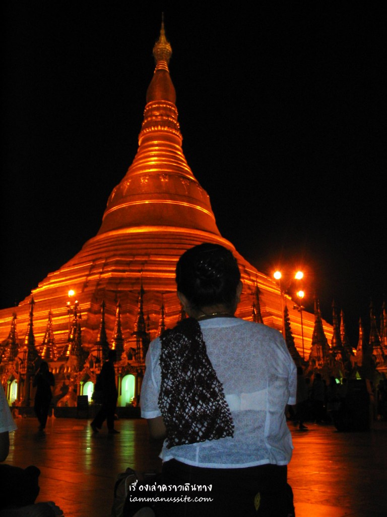 ออกมาเดินด้านนอกตอนแสงอาทิตย์เริ่มเร่งแสงสีแรงจัดช่วงสุดท้ายก่อนจะค่อยๆราแสงลงไป องค์พระธาตุสะท้อนแสงอุ่นๆสวยงามจับใจ เมื่อหมดแสงอาทิตย์องค์พระธาตุก็ยังสว่างสดใสด้วยแสงจากโคมไฟ มานิตย์บอกว่าพระเจดีย์ชเวดากองไม่มีมืด คุณจะมองเห็นองค์เจดีย์ได้ทุกที่ทุกเวลา