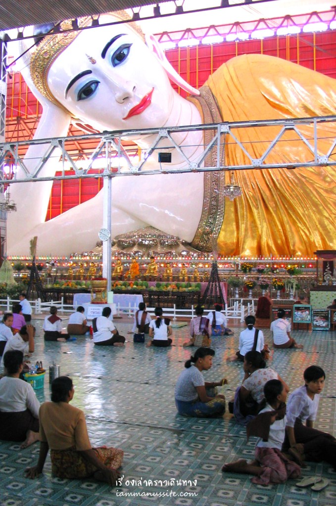 จากนั้นก็นั่งรถข้ามแม่น้ำย้อนกลับมาย่างกุ้ง มาแวะนมัสการพระนอนที่วัดเจ๊าทัตยี เป็นพระนอนองค์ใหญ่ลำดับ 3 ของพม่ามีความยาว 65 ม. หลายคนเรียกพระนอนตาหวาน เพราะพระพุทธรูปพม่าองค์นี้มีขนตายาวงอนเช้ง ทำให้ดูตาหวานกันเลย (อันนี้แปลกมาก) ดวงตาที่ดูสดใสนั้นผลิตจากแก้วที่สั่งทำพิเศษจากประเทศญี่ปุ่น เพื่อให้ดวงตามีลักษณะเหมือนกับดวงตามนุษย์จริงๆ ส่วนปลายเท้าก็วางไขว้กันเหมือนพระนอนชเวตาเลียว ที่เมืองหงสาวดี ที่ฝ่าเท้ามีลวดลายเป็นมงคล 108 ประการ ที่ฐานรอบๆองค์พระมีรูปปั้นรูปวาดเกี่ยวกับพุทธศาสนา ที่วัดนี้เนืองแน่นไปด้วยคนพม่าที่มากราบไหว้ขอพรกัน