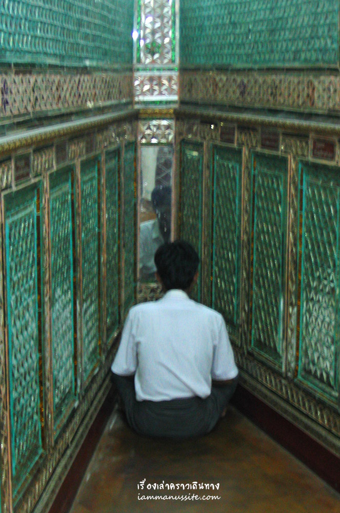 ผนังด้านในขององค์เจดีย์ประดับกระเบื้องสีเขียว สวยงามวิบวับ มีมุมสำหรับฝึกสมาธิหลายจุด แม้คนจะเยอะ เดินกันขวักไขว่ แต่ก็มีพระ มีผู้ศรัทธามานั่งสมาธิอยู่ทุกซอกทุกมุม