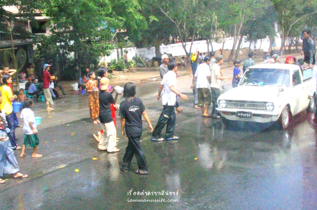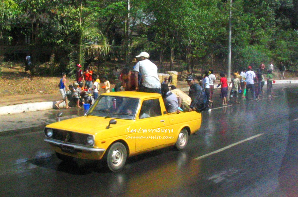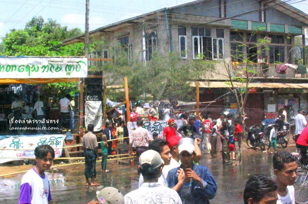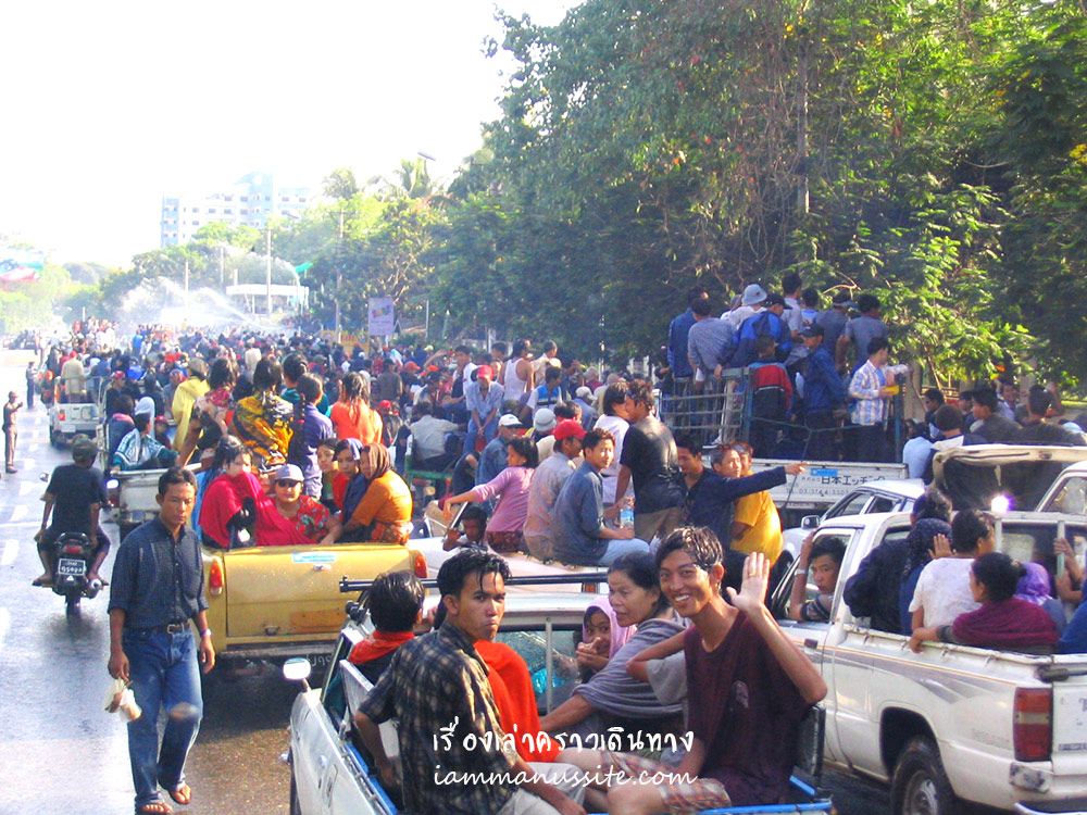 ระหว่างทางเห็นชาวพม่าเล่นน้ำสงกรานต์กันจริงจัง แบบว่าจริงจังมาก มีการตั้งเวทีริมถนนกันหลายเวทีมาก มีต่อท่อน้ำมาให้เล่นกันแบบสะดวกสบาย ฉีดกันเข้าไป ทั้งฉีดทั้งสาด ความสนุกของนักท่องเที่ยวคือนั่งรถบัสหน้าต่างบานใหญ่มองเห็นชัด รถติดเคลื่อนได้ช้าๆ โดนสาดไปตลอดทางประหนึ่งได้เล่นด้วย แต่ตัวไม่เปียก
