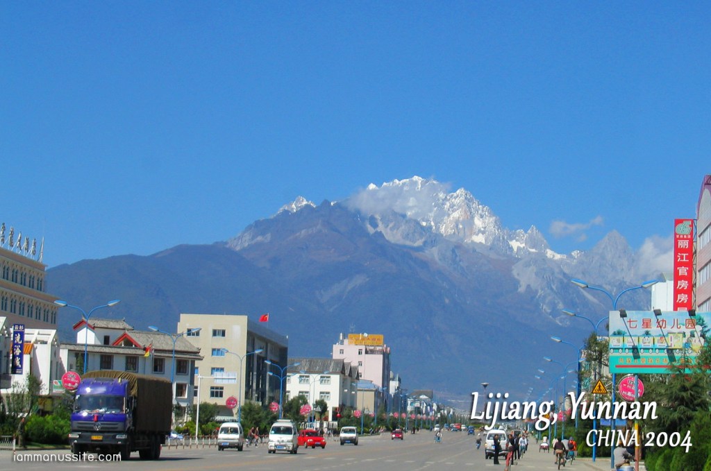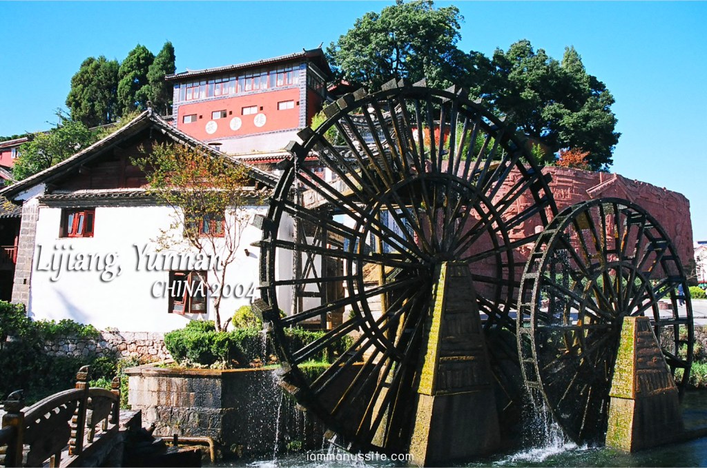 นั่งรถไปสักพักก็ไปแวะที่ เมืองโบราณลี่เจียง (Lijiang Old Town) หรือ เมืองเก่าต้าเหยียน (Dayan Old Town) ปล่อยให้เดินเล่นกันสัก 2 ชม. สมชายบอกให้ไปถ่ายรูปวงล้อใหญ่ๆซึ่งเป็นสัญญลักษณ์ของ Old Town ก็ว่าได้ แม้จะดูเป็น Tourist point ยังไงก็ไม่รู้ แต่ก็ถ่ายมาสัก 2 – 3 รูป (กลัวสมชายขอดู) ช่วงต้นๆของเมืองโบราณดูแล้วเป็นเมืองจัดตั้งมากๆ มีแต่ร้านขายของ….ที่ไม่มีคนซื้อ มีแต่นักท่องเที่ยวเดินๆดูๆ ถ่ายรูป มีชาวบ้านแต่งชุดพื้นเมืองเดินเป็นระยะๆ เห็นเมื่อไหร่ก็วิ่งไปถ่ายรูปกันใหญ่ มองย้อนไปทางเข้าจะเห็นฉากหลังเป็น ภูเขาหิมะมังกรหยก (Jade Dragon Snow Mountain) มีหิมะคลุมยอดเขา ก็สวยงามดีแท้ ฟ้างี้ใสเชียว ไม่มีเมฆสักก้อน