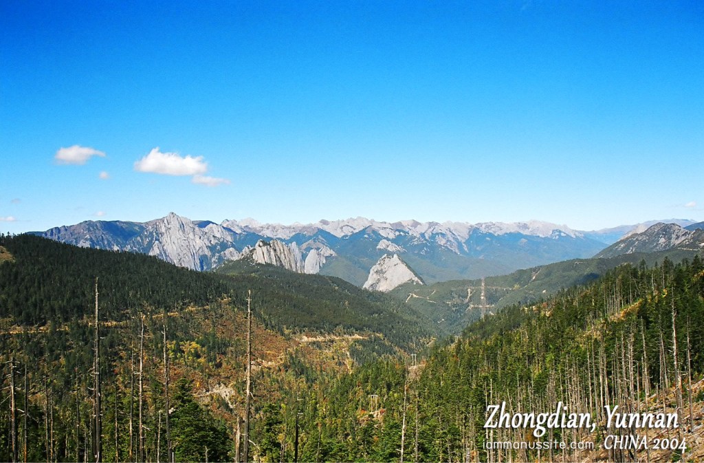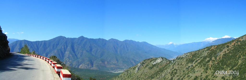 กว่าจะได้ทานกลางวันก็บ่ายกว่า อิ่มแล้วออกเดินทางต่อ วันนี้เราจะนั่งรถไปจนถึง เมืองจงเตี้ยน (Zhongdian, 中甸) หรือว่า เมืองแชงกรีล่า (Shangri-la, 香格里拉市) ออกจากลี่เจียงไม่นานก็จอดให้ลงไปชักภาพริมถนนทางโค้งบนยอดเขาสูง มองเห็นภูเขาหิมะเป็นทิวแถว ไม่แน่ใจซะแล้วว่าภูเขาหิมะอะไร ถ้าจำไม่ผิดสมชายจะเรียกว่าภูเขาหิมะไม่มีชื่อ 555 จริงๆนะ ก็ลงมาถ่ายรูปริมถนนกันพอสนุกสนาน สมชายได้แต่ร้องเตือนว่าให้เดินช้าๆ ทำอะไรช้าๆ และอย่าตื่นเต้น 5555 วิวสวยงามมากแต่ก็เสียวรถเลี้ยวโค้งมาสอยซะจริงๆ
