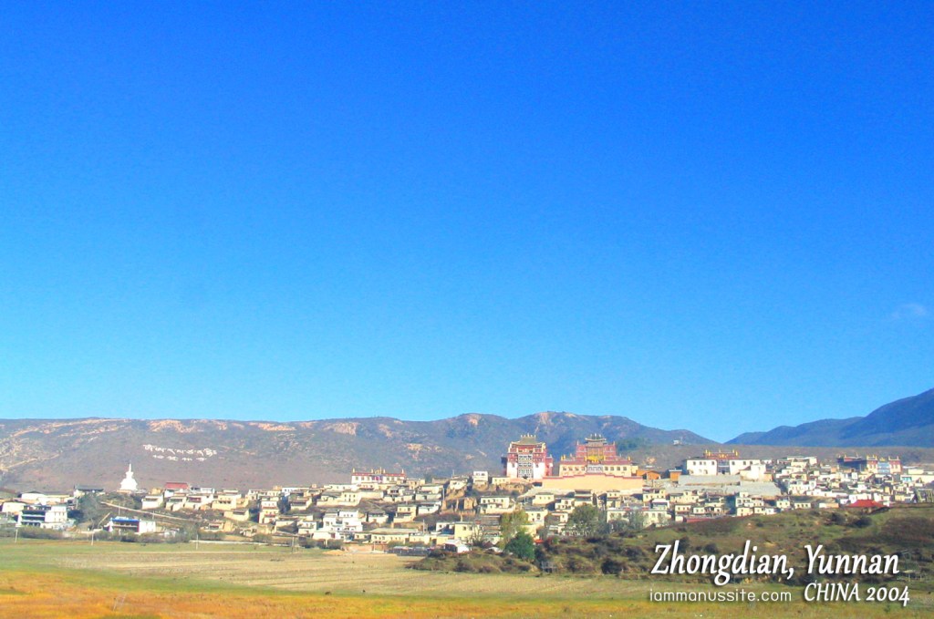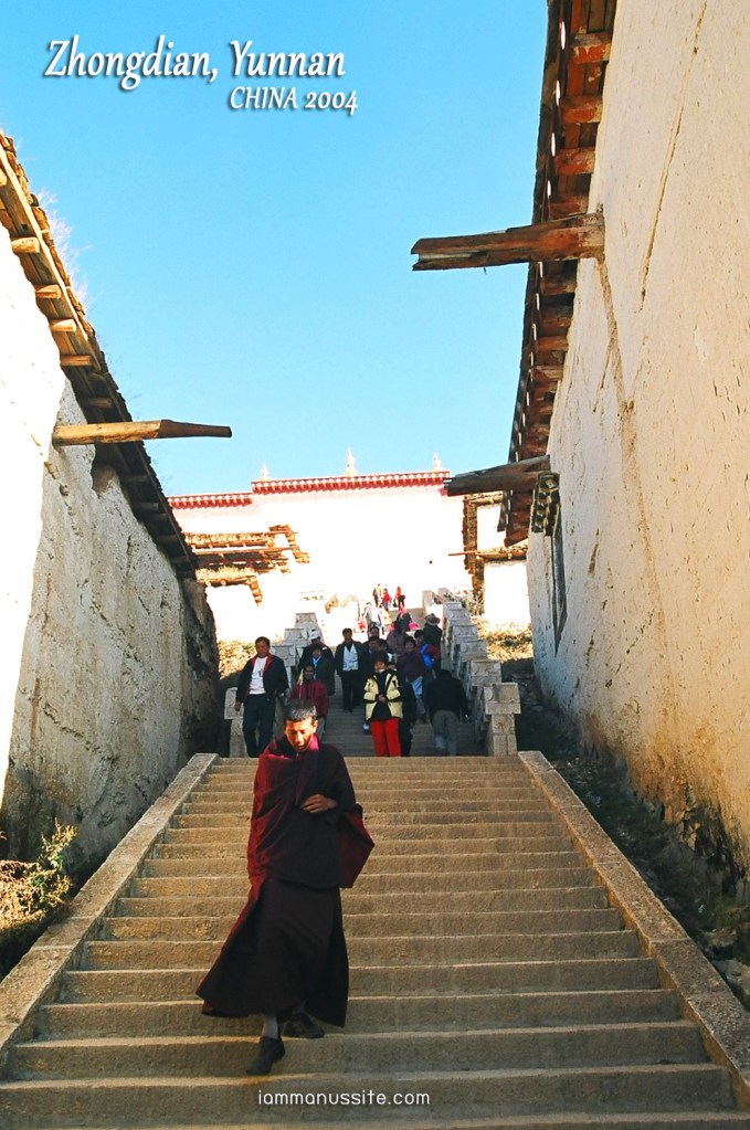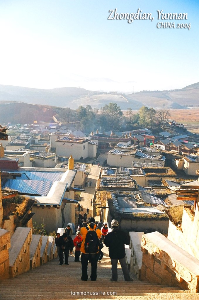 โปรแกรมวันนี้ จะไป วัดซงจ้านหลิน (SongJanLin) ซึ่งเป็นวัดที่เป็นไฮไลท์ของเมืองจงเตี้ยนเลย รูปแบบเอามาจากพระราชวังโปตาลา ที่เมืองลาซา ธิเบต วัดอยู่ไม่ไกลนักนั่งรถไปไม่ถึง 10 นาที ระหว่างทางจะมีจุดที่มองเห็นเนินเขาที่เป็นที่ตั้งของวัดและบ้านธิเบตชัดเจน ควรค่าแก่การจอดถ่ายรูป แต่รถคันใหญ่จอดไม่ได้ เสียดายมาก เซ็งในอารมณ์ประมาณหนึ่ง รถขับผ่านไปถึงทางเข้า ธรรมดาจะให้คนลงที่ประตูทางเข้าด้านล่างนี้ แล้วเดินขึ้นบันไดไปเป็นร้อยขั้น แต่เรามากับสมชายนี่นะ ให้รถขึ้นไปส่งถึงด้านบนเลยเข้าด้านหลังวัด แล้วเดี๋ยวเดินลงเหนื่อยน้อยกว่า