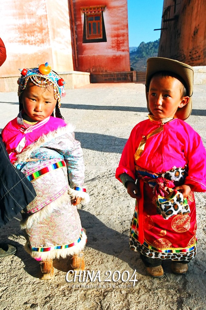 ด้านนอกมีเด็กชายหญิงคู่หนึ่งกำลังยืนแต่งตัวอยู่แม่กำลังจัดแต่งชุดงามให้ สงสัยอยู่แล้วว่ามาแต่งตัวทำไมในวัด พอยกกล้องขึ้นส่อง เจ๊ก็ร้องโหวกเหวกโวยวาย ให้เพื่อนลองฟังได้ความว่า 2 หยวน แหม๊…..เอาลูกมาแต่งตัวหากินแต่เช้า เด็กท่าทางยังไม่ตื่นเลย ถือว่ากระจายรายได้ ก็เลยจ่ายไป 2 หยวน ว่าแล้วพวกเราก็รุมกันถ่ายภาพ เท่านั้นแหละ ตัวแม่โวยวายว่าอะไรไม่รู้ ตัวเด็กวิ่งมาไล่ตบเลย 555 น่าจะเป็นว่า 2 หยวนสำหรับกล้อง 1 ตัว หรือ 2 หยวนได้แค่เด็ก 1 คนอะไรประมาณนี้ แต่ก็กดกันไปได้หลายภาพแล้วเลยวิ่งหนีดีกว่า เขี้ยวจริงๆ