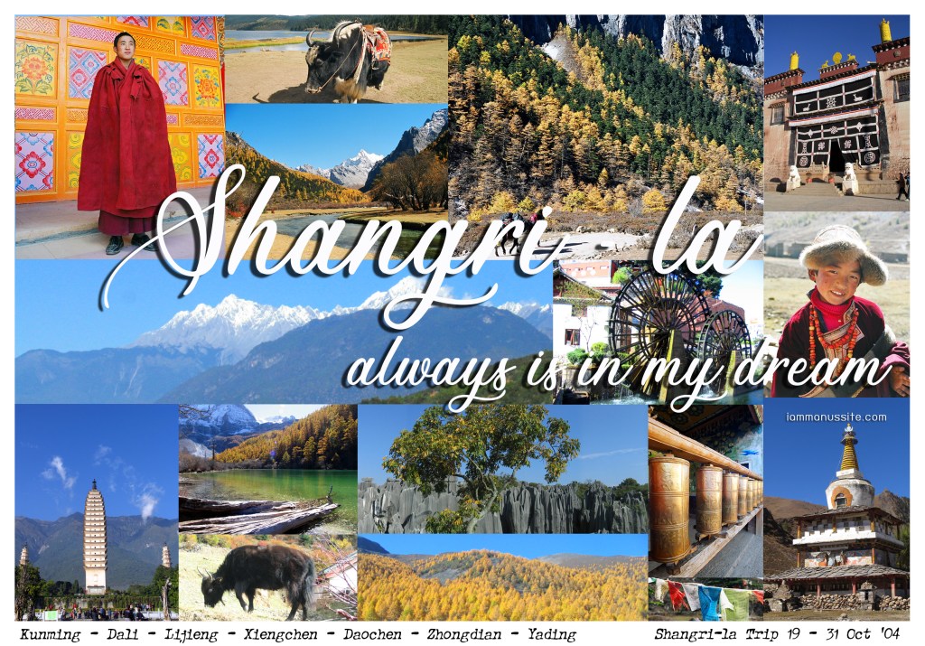 ท่องเที่ยวตามแบบเนเจอร์กึ่งทัวร์ ต้องสนุกแน่ ทริปยาว 9 วัน ชื่อทริปชัดเจนว่า Shangri-la trip ก็คือการบุกไปค้นหา Shangri-la ดินแดนสุดขอบฟ้า ที่เถียงกันมาตลอดว่ามันคือตรงไหนของโลกหนอ ที่โจเซฟ ร็อคบรรยายไว้ ที่แน่ๆมันอยู่ในแถบมณฑลยูนนานของจีน ทริปเดินทาง เริ่มต้นที่คุนหมิง ไปลี่เจียง (เพื่อพักร่างกายให้คุ้นชินกับระดับความสูงที่เพิ่มขึ้น) แล้วนั่งรถยาวๆไปเซี่ยงเฉิง – เต้าเฉิง ไปค้นหาแชงกรีล่าที่อุทยานย่าดิง แล้วกลับทางเดิมมาเที่ยวเมืองจงเตี้ยน ที่ออกมาอ้างว่าแชงกรีล่าคือความสวยงามของเมืองจงเตี้ยนแห่งนี้นั่นแหละไม่ต้องไปตามหาที่ไหนแล้วพี่น้อง แล้วก็บินกลับคุนหมิงเพื่อกลับเมืองไทย ตามนี้