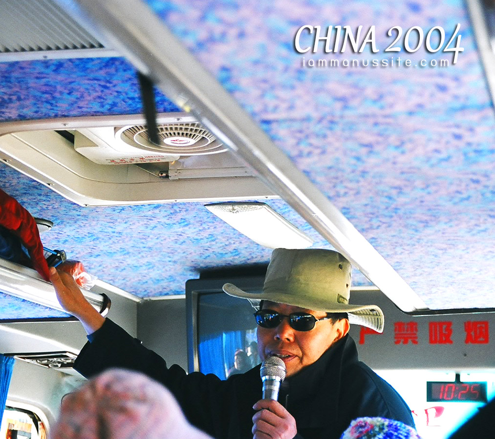 มาถึงลี่เจียงอากาศเริ่มเย็นลงอีก เอากระเป๋าออกจากสายพาน เคลื่อนพลขึ้นบันไดเลื่อนไปชั้นบน มีคนยืนเสียงดังโหวกเหวกอยู่ โห….เท่ห์ซะ สวมเสื้อคลุมยาวสีดำ ใส่หมวกปีก แต่หน้าดุมาก แต่งตัวประหนึ่งเจ้าพ่อเซี่ยงไฮ้ ขึ้นมาถึง ก็ต้อนขึ้นรถ รถมี 2 คัน ใหญ่ 1 เล็ก 1 คันใหญ่ได้ประมาณ 30 กว่าที่ คันเล็กอีก 20 กว่าที่ รวมกระเป๋าด้วยก็แน่นไปหมด ตอนนี้ทุกคนรวมกันนั่งที่คันใหญ่ เอากระเป๋าไปไว้คันเล็ก