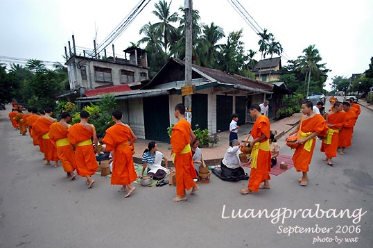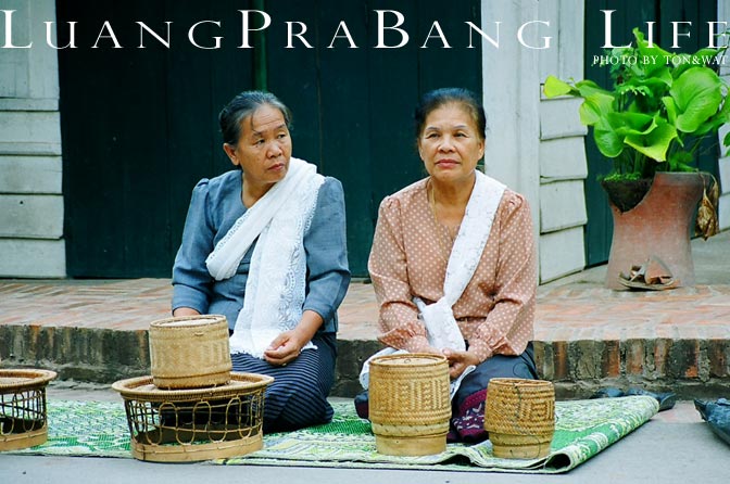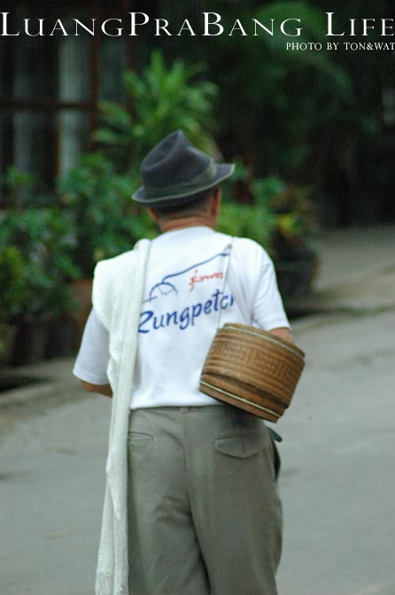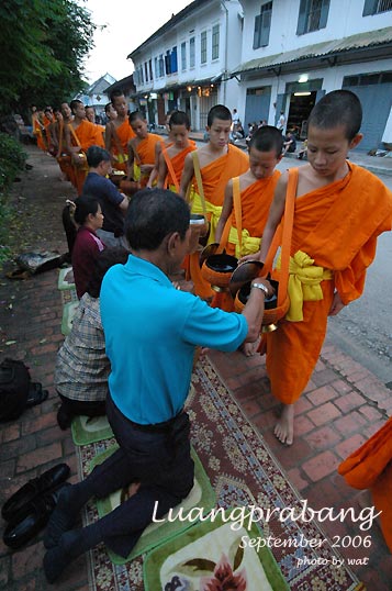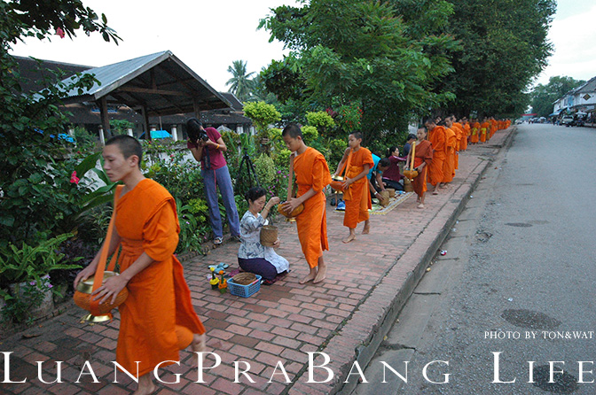 ตามธรรมเนียมของการมาเที่ยวหลวงพระบางก็ต้องไปตักบาตรข้าวเหนียว ติดต่อโรงแรมไว้เรียบร้อยให้จัดชุดตักบาตรไว้ให้ ถึงเวลาก็มาขึ้นรถพาเข้าเมือง มีแขกของโรงแรมร่วมรถกันไปหลายคน โดยเขาจะมีปูเสื่อไว้ให้เป็นทางยาว ก็ไปเลือกนั่งตรงที่ว่างๆ แต่งตัวให้เรียบร้อย หลายๆคนก็เตรียมชุดผ้าซิ่นสวยงามกันมาเพื่อการนี้กันเลย นานๆทีจะได้ใส่ชุดแบบนี้ แล้วไม่ดูแปลก เพราะชาวลาวนุ่งซิ่นกันเป็นชุดปกติอยู่แล้ว