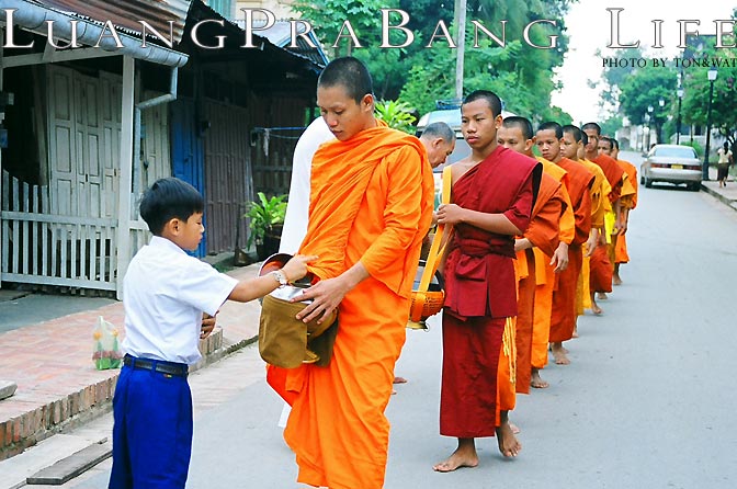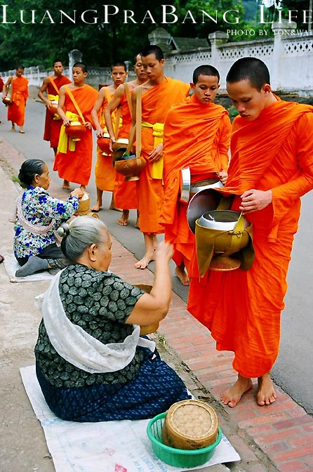 ธรรมเนียมการตักบาตรข้าวเหนียวของหลวงพระบางมีแต่ดั้งเดิม เมื่อถึงเวลาจะมีการเคาะเกราะไม้ไผ่ให้ชาวบ้านได้รับรู้ บรรดาญาติโยมก็จะเตรียมนำเสื่อนำกระติ๊บข้าวเหนียวมาปูนั่ง รอพระเดินผ่านมา ได้เวลาจะมีพระสงฆ์เดินเรียงแถวกันมารับบาตรจากชาวบ้านเป็นทิวแถว โดยชาวลาวจะใส่แต่ข้าวเหนียวลงไปในบาตร เมื่อพระสงฆ์กลับไปวัดแล้ว พอถึงเวลาฉัน ก็จะเคาะเกราะไม้ไผ่เป็นสัญญาณให้ชาวบ้านรับรู้ ชาวบ้านก็จะเอากับข้าวที่เตรียมไว้ไปถวายพระที่วัด ซึ่งเรียกว่าการ “ถวายจังหัน”