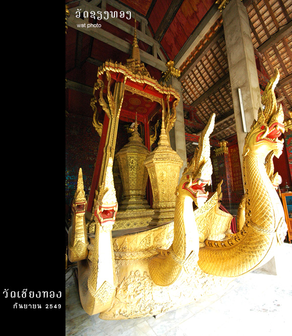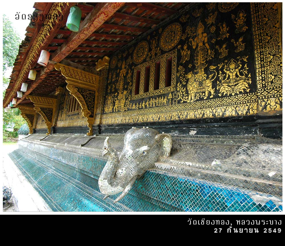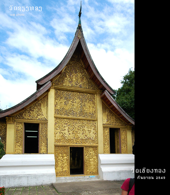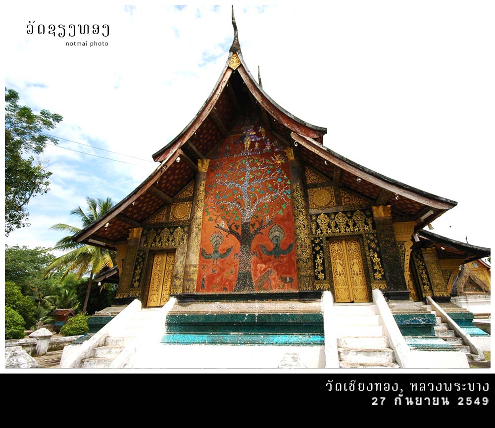 วัดเชียงทอง เป็นวัดหลวงประจำราชวงศ์ล้านช้าง ที่ไม่โดนเผาทำลายจากสงคราม เป็นโชคดีของคนรุ่นหลัง ภาพคุ้นตาจากนักท่องเที่ยวที่มาหลวงพระบางทุกคนคือภาพสิมวัดเชียงทอง ที่มีหลังคาซ้อน 3 ชั้น แบบล้านช้าง มีผนังด้านข้างเป็นลายรดน้ำปิดทองบนพื้นสีดำ ส่วนผนังด้านหลังเป็นรูปต้นทองประดับกระจกสีสวยงาม สิมวัดเชียงทองนี่มีต้นแบบมาจากวิหารวัดโลกโมฬีเชียงใหม่ นึกแล้วก็จริง เหมือนกันมากๆ