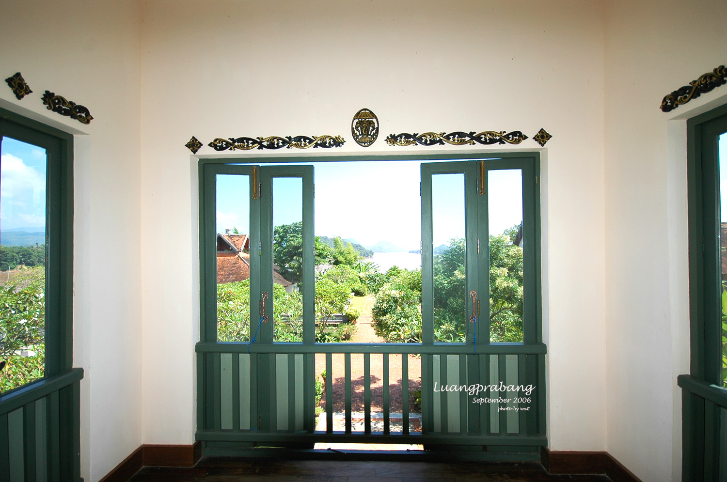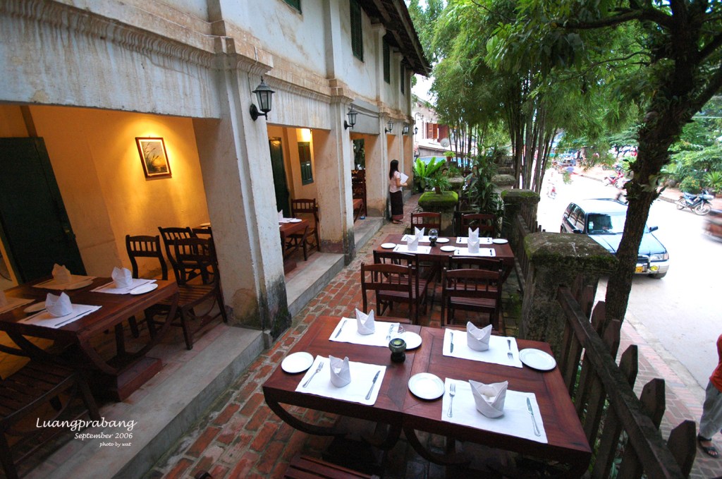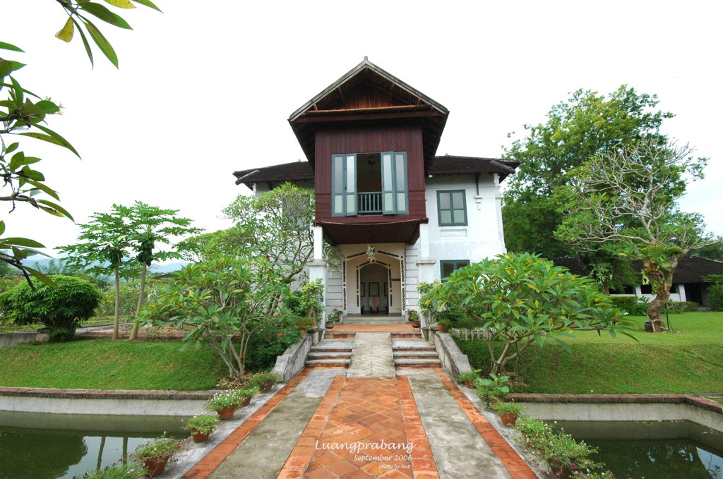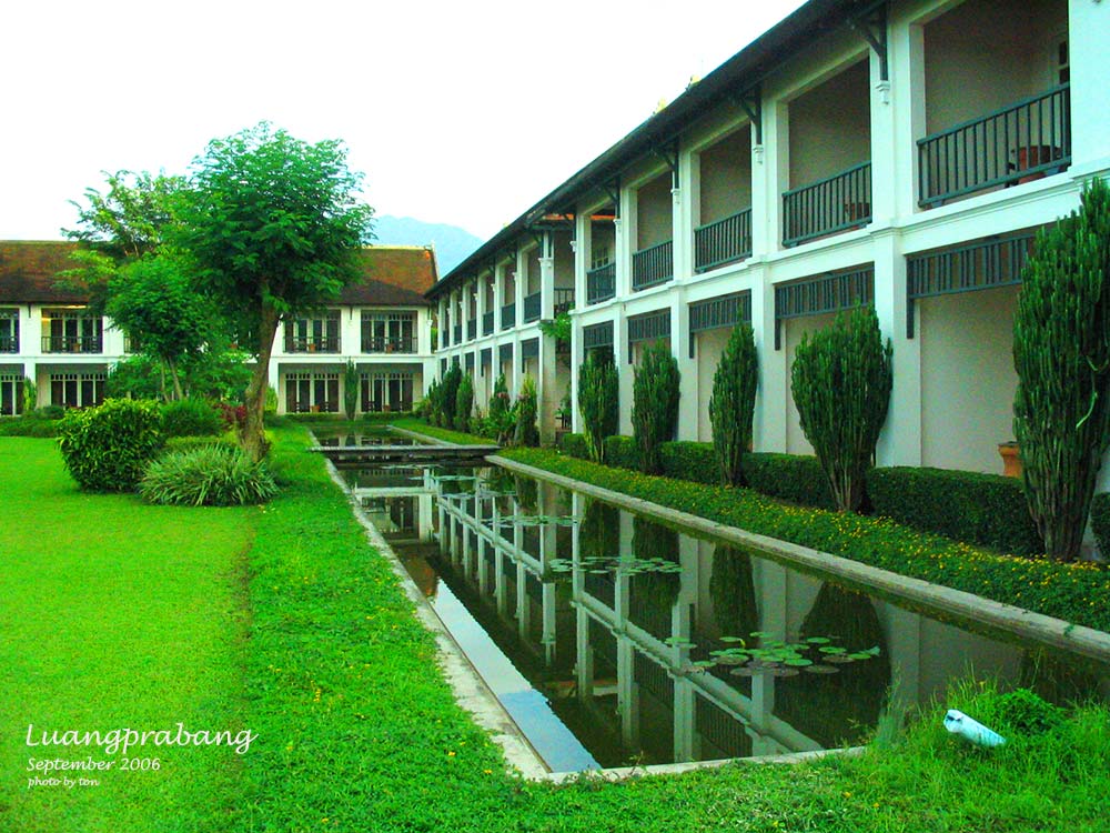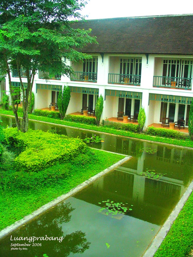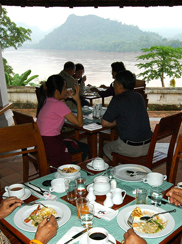 กลับถึงโรงแรม ไปทานอาหารเช้าที่ห้องอาหารได้ทัน ห้องอาหารเช้าบรรยากาศดีจริงๆ เปิดโล่งรับลมเย็นๆเห็นวิวแม่น้ำและภูเขา อิ่มดีก็ให้พ่อกับแม่ไปพักผ่อนกันสักพัก ส่วนเราก็ไปเดินสำรวจโรงแรม เพราะแกรนด์หลวงพระบางเป็นคุ้มเก่า ของเจ้าเพชรราช รัตนวงศา ผู้ปลดแอกลาวจากการปกครองของฝรั่งเศส และรวมแผ่นดินลาวทั้งหมดให้เป็นอันหนึ่งอันเดียวกัน ในช่วงหลังสงครามโลกครั้งที่ 2 และยังเคยเป็นนายกรัฐมนตรีของลาวในช่วง พ.ศ. 2485 – 2488 ทั้งหมดนี้อ่านเอาได้จากข้อมูลที่โรงแรมมีติดไว้ตามผนัง