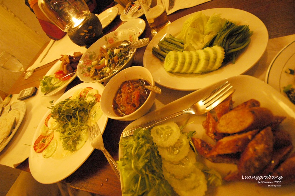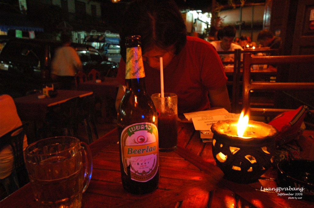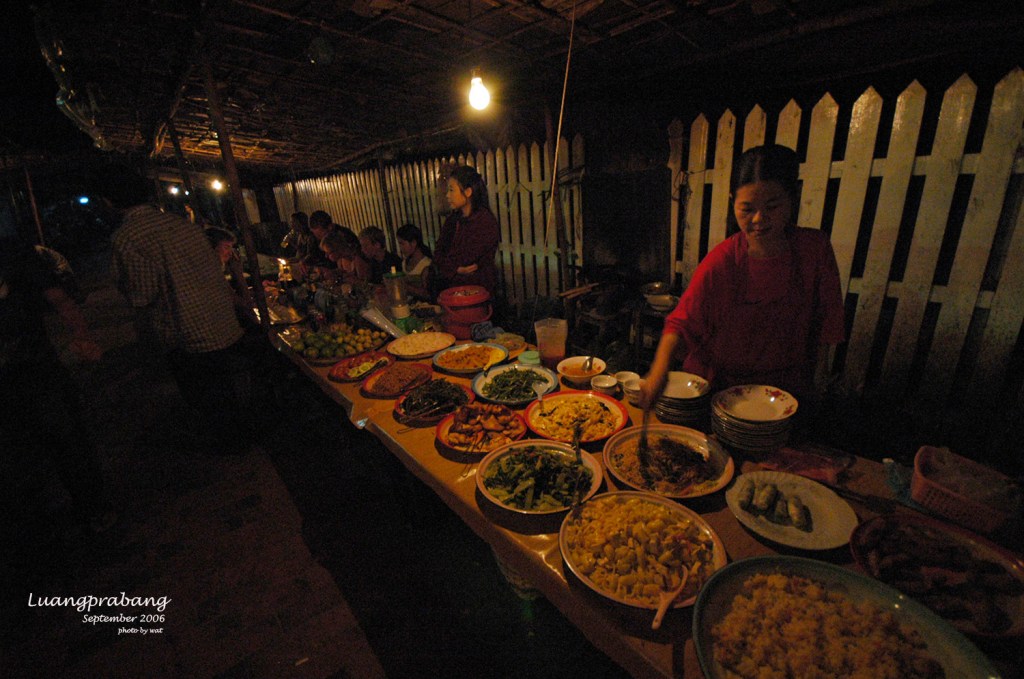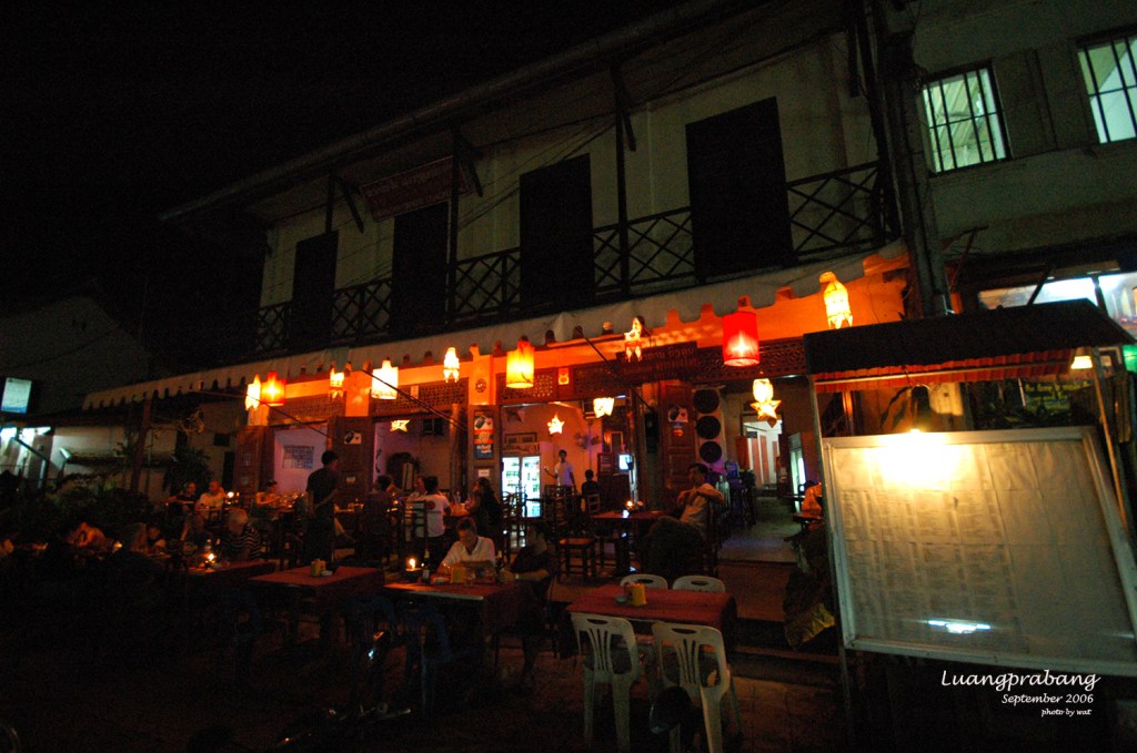 เย็นนี้ทานอาหารเย็นที่ร้านนอกโรงแรม จำชื่อร้านไม่ได้แฮะ หนึ่งในร้านดังของหลวงพระบาง ร้านต้อนรับนักท่องเที่ยวก็ออกจะหรูหราหน่อยๆ อาหารอร่อยใช้ได้ มากับพ่อแม่ก็ต้องทานอาหารเย็นเร็วหน่อย อิ่มก็เพิ่งจะเริ่มมืดพอดี หาเรียกรถสองแถวพากลับไปส่งโรงแรม เพราะไม่ตรงรอบรถของที่พักแล้ว