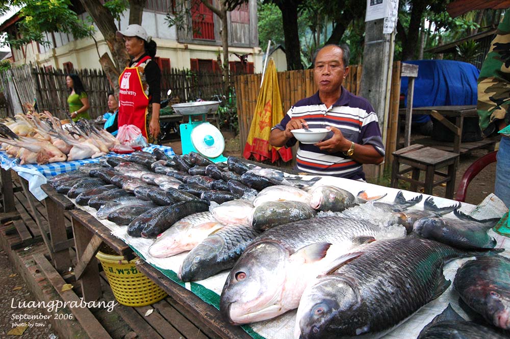 ตักบาตรเรียบร้อย ยังพอมีเวลาก่อนรอบรถกลับโรงแรม ก็เลยไปเดินเล่นตลาดเช้า ปลาแม่น้ำโขงตัวโตจริงๆ มีพืชผักหลายอย่างที่ไม่รู้จัก แต่ส่วนมากแล้วก็เหมืองผักไทยๆ เดินเล่นเพลินๆไปเพราะเป็นตลาดสดจะให้ซื้ออะไรได้ล่ะ ผ่านตลาดไปถึงถนนเลียบแม่น้ำโขง แวะจิบกาแฟร้านประชานิยมตามธรรมเนียม