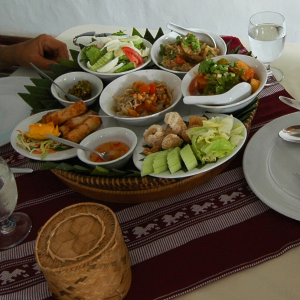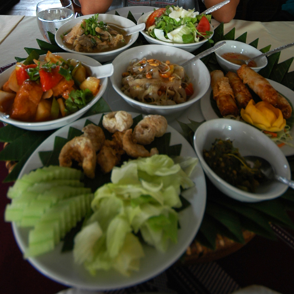 เที่ยงพอดี แวะเข้าร้าน ตำหนักลาว เพื่อจัดอาหารกลางวันก่อน สั่งมาเป็นชุด 2 ชุด ของพ่อกับแม่เป็นส้มตำไทยไม่เผ็ด ของเราได้กินส้มตำหลวงพระบาง เครื่องเคียงมาครบเหมือนขันโตกไทยๆ อร่อยถูกใจมาก