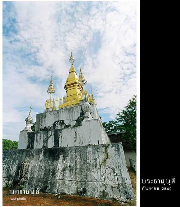 ออกจากหอคำก็ข้ามถนนไปที่ทางขึ้น เขาพูสี (Mount Phou Si) เพื่อขึ้นไป พระธาตุพูสี (Phou si, ພະທາດພູສີ) ต้องเดินขึ้นบันไดไปยอดเขาซึ่งก็ไม่ได้สูงมากหรอก แค่ 328 ขั้นเอง แต่แม่บอกว่า ฉันไม่ขึ้นนะจ๊ะ คนขับรถเลยพาไปรอตรงทางลงฝั่งตรงข้าม พวกเราเดินขึ้นไปด้านบนกับพ่อ แวะหยุดพักเป็นระยะตามแต่พ่อจะเหนื่อย ไม่นานก็ขึ้นมาถึงยอดเขาที่ วัดจอมสี (Wat Chom Si, ວັດຈອມສີ) ที่มีพระเจดีย์สีทองเป็นจุดเด่น เข้าไปกราบสักการะเพื่อความเป็นสิริมงคลกันก่อน แล้วก็ออกมาเดินชมวิวเมืองหลวงพระบาง