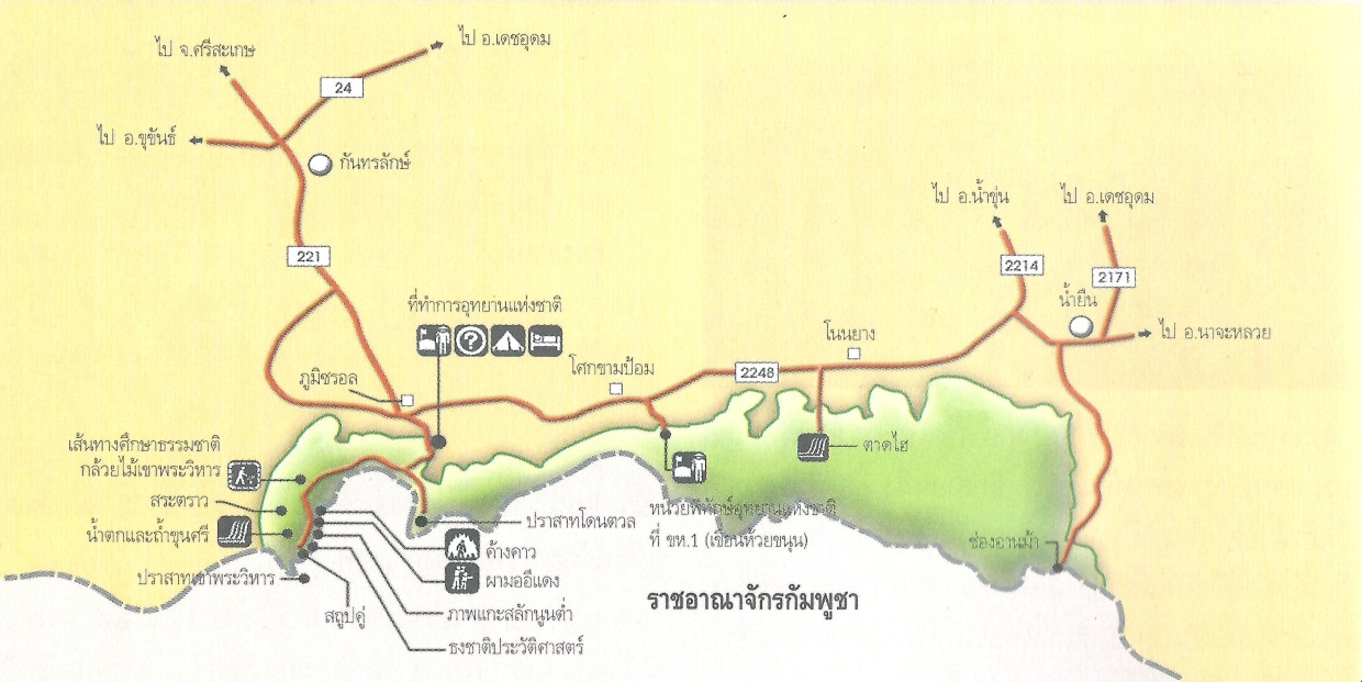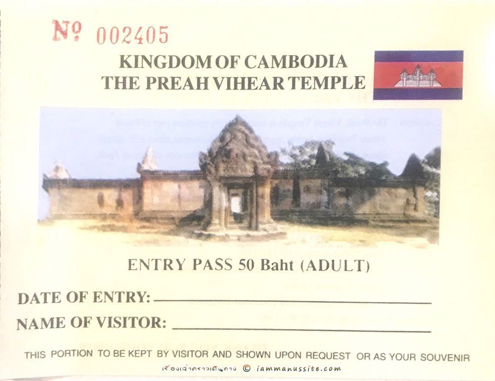 จากจุดนี้ต้องเดินผ่านจุดตรวจฝั่งไทยไปผ่านจุดตรวจฝั่งกัมพูชา แล้วซื้อบัตรเข้า รายได้เข้ากัมพูชา จุดเข้าประสาทเขาพระวิหารอยู่ในเขตพื้นที่ จ.พระวิหาร ประเทศกัมพูชา พอพ้นเขตตรวจบัตรเข้าแล้ว กลายเป็นพื้นที่ของประเทศเขมร
