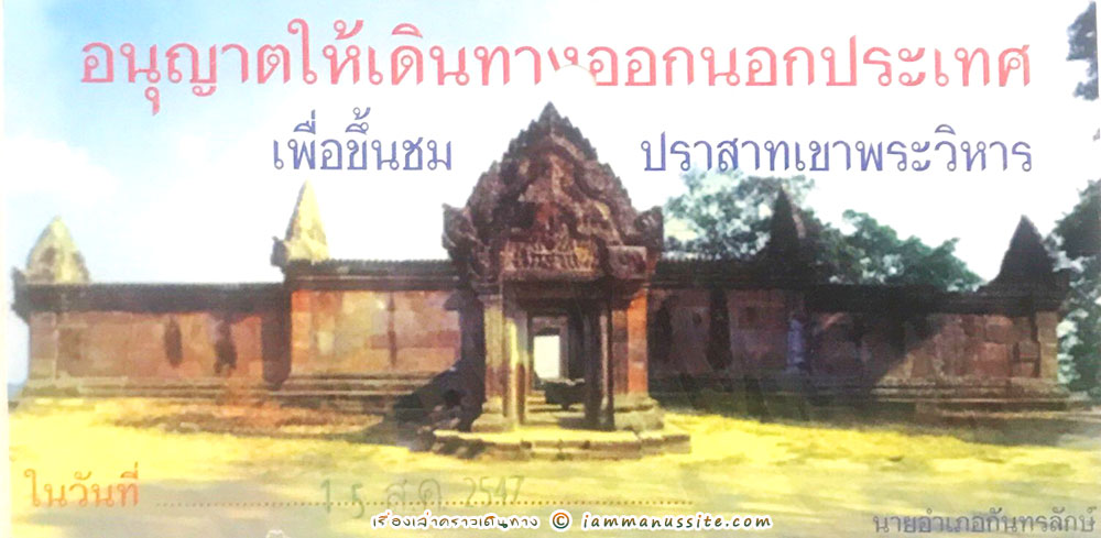 ปลายปี 2551 ไปธุระที่อุบลราชธานี มีเวลาเหลือค่อนวันเลยถือโอกาสไปเที่ยวเขาพระวิหาร ในตอนที่ยังถกเถียงกันเพื่อถือกรรมสิทธิ์ในพื้นที่ปราสาท การจะไปเที่ยวเขาพระวิหาร ก็ต้องไป อุทยานแห่งชาติเขาพระวิหาร อำเภอกันทรลักษ์ จังหวัดศรีสะเกษ ตัวปราสาทสร้างอยู่บนยอดเทือกเขาพนมดงรัก ถนนหนทางดีพอใช้ได้ วิ่งขึ้นเขาวนไปวนมาไม่นาน ก็มาถึงผามออีแดง บริเวณนี้สามารถยืนมองไปเห็นบริเวณชะง่อนผาที่ตั้งของปราสาทเขาพระวิหารได้
