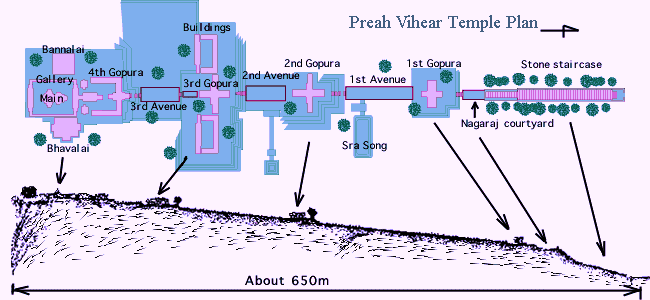 ทางเดินไปสู่ตัวปราสาทเป็นบันไดศิลาแลง ตามแบบฉบับปราสาทขอม ทางเดินยาวร่วม 700 ม. พาไปถึงปราสาทประธาน สุดเขตคือบริเวณหน้าผาที่เรียกกันว่า “เป้ยตาดี” เป็นหน้าผาสูง 500 ม.จากพื้นราบของกัมพูชา การจะเข้ามาส่วนปราสาทจึงต้องมาเข้าทางประเทศไทย ถ้าจะเข้าทางเขมรต้องปีนหน้าผาขึ้นมา