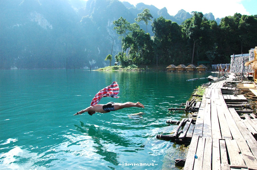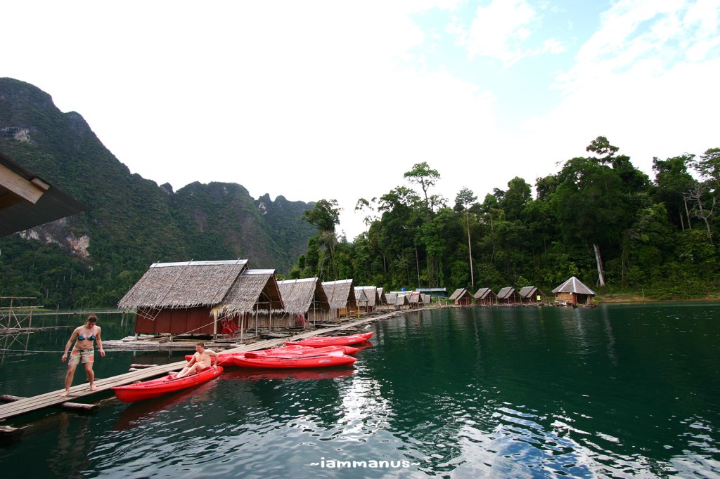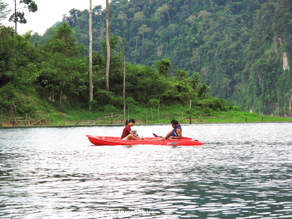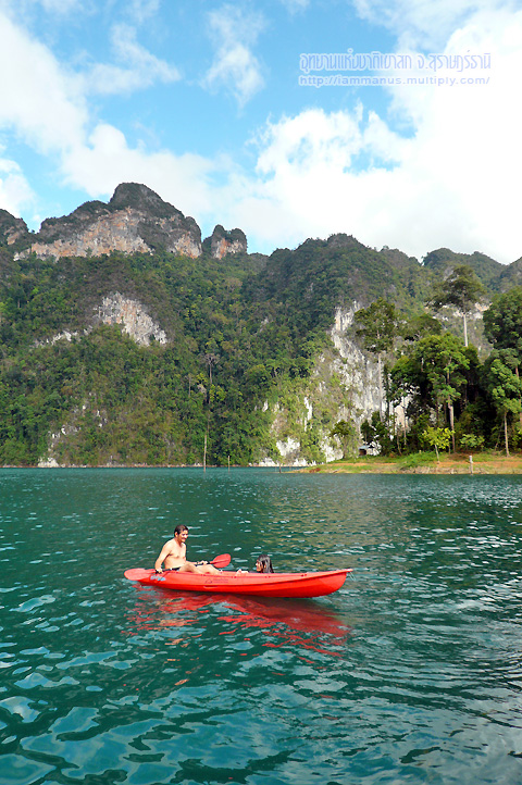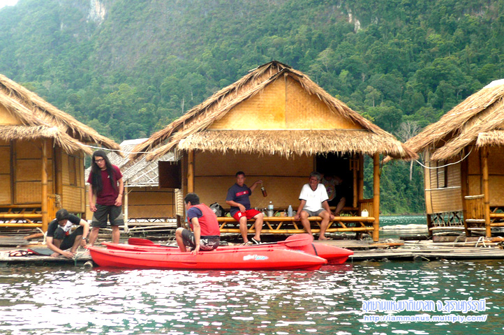 เมื่อเข้ามาในบริเวณสันเขื่อน บรรยากาศก็สวยแล้ว แวะชมวิวถ่ายรูปกัน แล้วไปที่ท่าเรือ มีเรือเช่าเหมาลำพาล่องชมอ่างเก็บน้ำที่กำหนดราคาไว้แล้ว ไม่ต้องต่อรองอะไรกันมาก แต่บรรยากาศดีๆมันคือช่วงเย็นและช่วงเช้า พวกเราก็เลยจองแพที่พักไว้ก่อนล่วงหน้าที่ “แพเพลินไพร” ราคาจะเป็นแพคเกจ รวมค่าเรือไป-กลับ ค่าที่พัก ค่าอาหาร มีหลายแพลองเลือกดู ก็ไปลงเรือตามที่นัดแนะกันไว้ นั่งเรือไปแพที่พัก กินมื้อเที่ยงที่แพ มีส่วนแพที่พักและแพอาหารด้วย อิ่มแล้วก็พักผ่อน เล่นน้ำ พายคายัค พร้อมตั้งวงดริ๊งค์กันไป รออาหารเย็นเสร็จ ก็เดินไปกินมื้อเย็นที่แพอาหารอีกรอบ