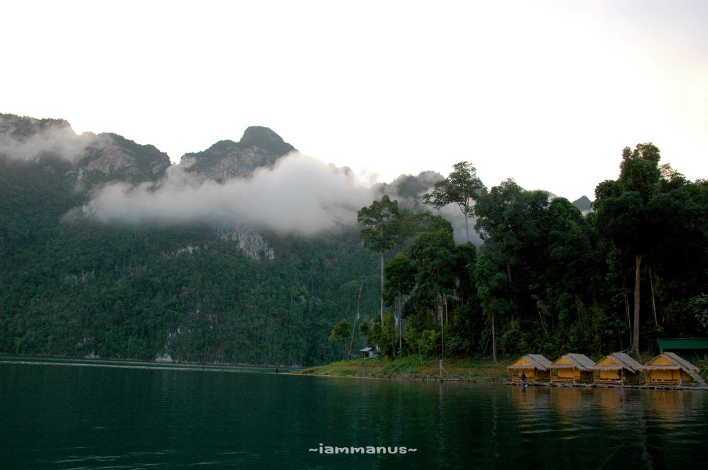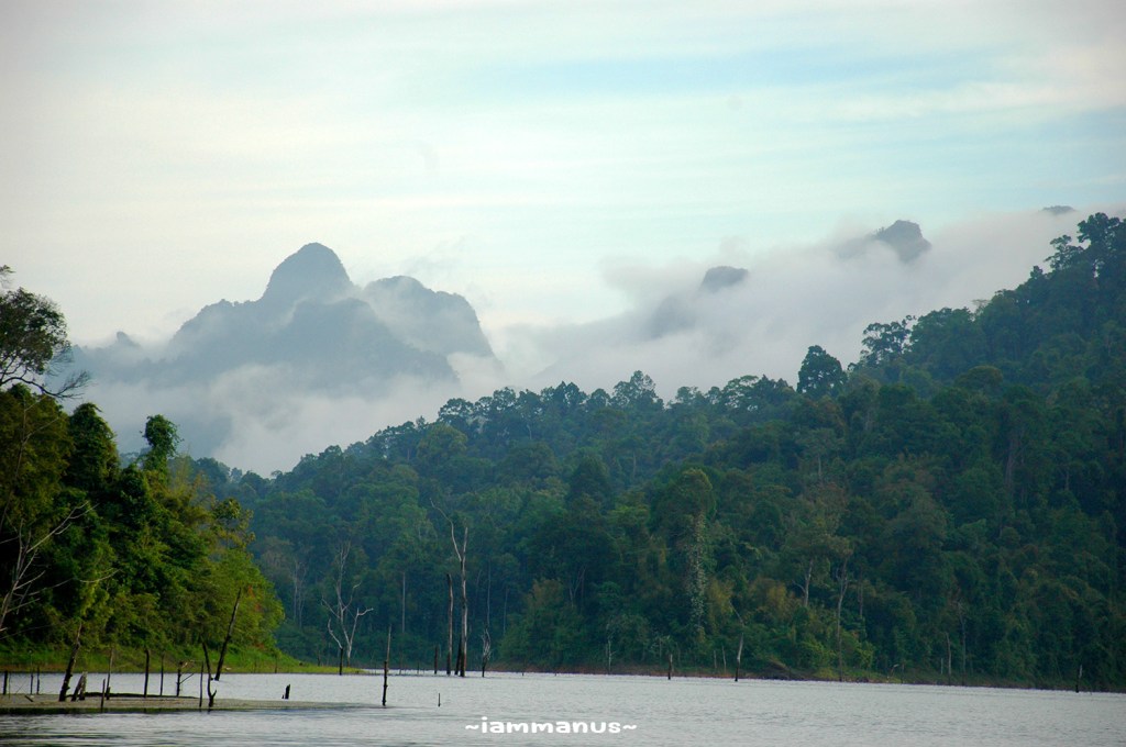 อากาศตอนเช้าเย็นสบายพอสมควร มีสายหมอกลอยตามยอดเขา นั่งริมน้ำมองสายหมอกกันไปจนได้เวลาตามที่นัดเรือไว้ จะพาล่องในทะเลสาบยามเช้า จะได้ไม่ร้อน และจะได้เห็นนกเห็นสัตว์ต่างๆได้ด้วย