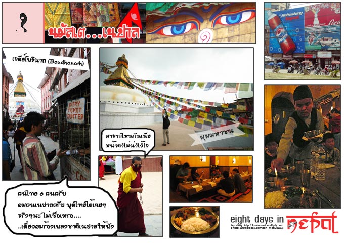 โชคดีที่ painaima.com เปลี่ยนให้เราใช้บริการการบินไทยแทนรอยัลเนปาลแอร์ไลน์ เครื่องจึงใหญ่นั่งสบาย อาหารอร่อย landing ก็นุ่มนวล แค่ 3 ชั่วโมงกว่าก็ถึงสนามบินตรีภูวัน เมืองกาฏมาณฑุประเทศเนปาลแล้ว ไปถึงตรงเวลาคือประมาณเที่ยงแก่ๆ ปรับนาฬิกาย้อนหลังไปประมาณ 1.15 ชั่วโมงก็เป็นเวลาเนปาลแล้ว จัดแจงผ่านขั้นตอนตม.ออกมา เจอเด็กหนุ่มหน้าตาไม่ยักเนปาลเท่าที่คาด ยืนถือป้ายรอรับ แนะนำตัวกันได้ความว่าชื่อ “อารบิน” เป็นชาวเนปาลแท้ แต่เคยไปบวชเรียนที่เมืองไทยอยู่ 6 ปี พูดไทยปร๋อแถมพูดใต้ได้อีกต่างหาก ฮ่าๆ มันส์แน่ๆ