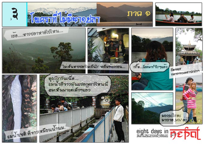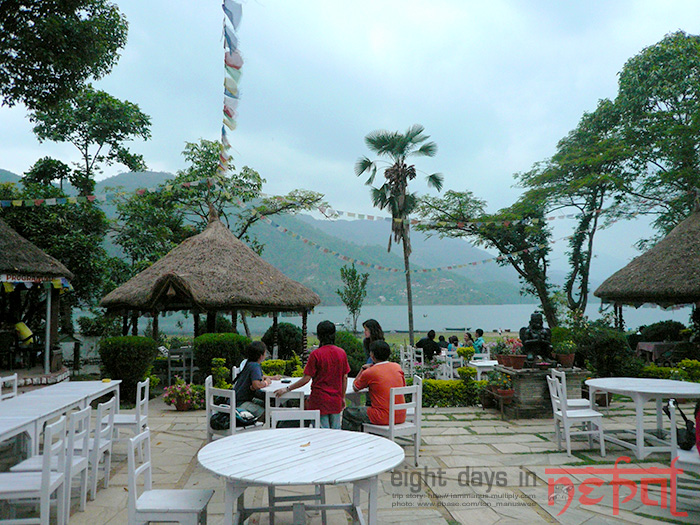 เย็นย่ำ กลับไปพบกับพรรคพวก เดินตามอารบินออกมากินอาหารเย็นที่ร้านชื่อ บูมเมอแรง นั่งที่สวนด้านนอกมองเห็นวิวทะเลสาบเฟวาด้วย ลมฝนพัดผ่านเป็นระยะๆ อารบินบอกว่าฝนตกคืนนี้จะดี เช้าจะได้ฟ้าใส พอเริ่มมืดไฟก็ดับพรึ่บ! เหมือนเดิม เนปาลนี่ไฟฟ้าไม่พอใช้ ต้องซื้อมาจากอินเดีย จึงต้องมีการแบ่งสรรปันส่วนกัน เปิด 8 ชั่วโมง ดับ 8 ชั่วโมง ประมาณนี้ สถานประกอบการต้องซื้อเครื่องปั่นไฟซื้อน้ำมันเอาเอง บ้านคนก็จุดเทียนเอา เขาจะมีตารางมาแจ้งเลยว่าพื้นที่ไหนจะดับช่วงไหนสลับกันไป คิดถึงที่บ้านเราแล้วรู้สึกได้เลยว่า บ้านเราใช้ไฟกันฟุ่มเฟือยเหลือเกิน