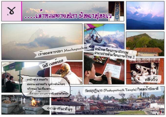 ตามคำแนะนำของใครๆบอกว่า ถ้าบินจากโพครากลับกาฏมาณฑุจงเลือกนั่งด้านซ้ายมือ คุณจะได้มองวิวเทือกเขาหิมาลัยอันน่าประทับใจ พวกเราจึงขนของไปจ่อหน้าประตูทางขึ้นเครื่องกัน ไกด์เนปาลอีกคนพาลูกทัวร์ญี่ปุ่นผัวเมียมาทีหลัง เข้าแทรกด้านหน้าทันทีซุบซิบๆกัน พอเขาเปิดประตู ท่านเล่นดันตัวผัวมาแทรกหน้าเลย บ๊ะ แถมหัวเราะชอบใจยกใหญ่ที่แซงพวกเราได้ น่าตบกระโหลกจริงๆ ตัวผัวนี่ใช้ได้เลย ทิ้งเมียไว้ด้านหลัง หลังกลุ่มเราไปอีก ทำไปได้ สรุปแล้วพวกเราทุกคนได้ที่นั่งด้านซ้าย รวมทั้งผัวเมียญี่ปุ่นด้วย ตาผัวได้ที่นั่งแถวแรกเลยแต่เจ๊แกได้ตรงปีกบังวิวเต็มๆ เลยหน้าตาไม่สบอารมณ์ ช่วยไม่ได้ผัวเจ๊ยังทิ้งเจ๊เลย ฟาดฟันกันมาได้ก็สบายใจ แอร์โฮสเตสแจกลูกอมและสำลีไว้อุดหู (ก็เครื่องใบพัดน่ะ) take off ปุ๊ป ฮ่าๆๆๆ วิวด้านซ้ายเมฆสวยจริง หิมาลัยอยู่ไหนฟระ แย่งกันแทบตาย โธ่…