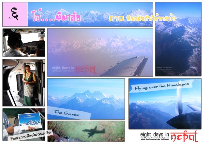 กลับมานั่งที่ปล่อยคนต่อไปเข้าไปบ้าง บ้างเดินไปห้องนักบิน บ้างขยับไปขอดูหน้าต่างคนอื่นที่ดีกว่า แอร์ก็เดินคอยชี้บอกชื่อยอดเขาต่าง ดูวุ่นวายยังกะรถทัวร์ ได้ยินเสียงแชะๆๆๆข้างหู หันไปเจอเจ๊ฝรั่งคนหนึ่งที่แกคงห่วยมาก แกเลยโดดมานั่งข้างๆ เอาเลนส์เสียบเฉียดหูเรามายิงรูปไม่ยั้ง แชะๆๆ จากที่เราถ่ายแต่พอประมาณ เหมือนโดนกดดันว่าหล่อนได้ที่ดีทำไมถ่ายน้อย เลยยกกล้องยิงไม่ยั้งบ้าง แข่งกันไปเลย 45 นาทีผ่านไปอย่างรวดเร็ว ทุกคนได้ประกาศนียบัตร 1 ใบเซนต์ชื่อโดยกัปตันถือลงเครื่องมาหน้าตายิ้มแย้มเบิกบาน อย่างน้อยเราก็ได้เห็นหิมาลัยเต็มๆตาล่ะ