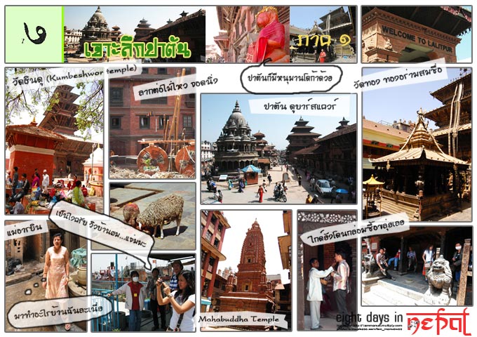 - Patan : Durbar square, Patan museum, วัดทอง, วัดฮินดู (Kumbeshwor temple), Mahabuddha Temple, Rudarvarna mahavihar, วิวชั้น 5 จากบ้านอารบินวันฟ้าใส สวยงามแน่ๆ!!!