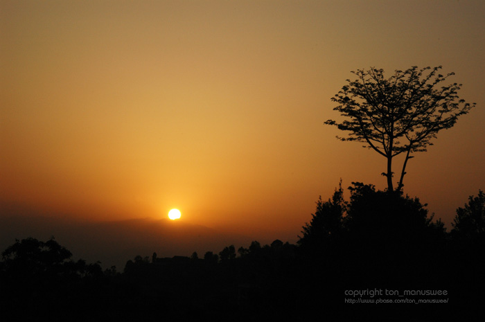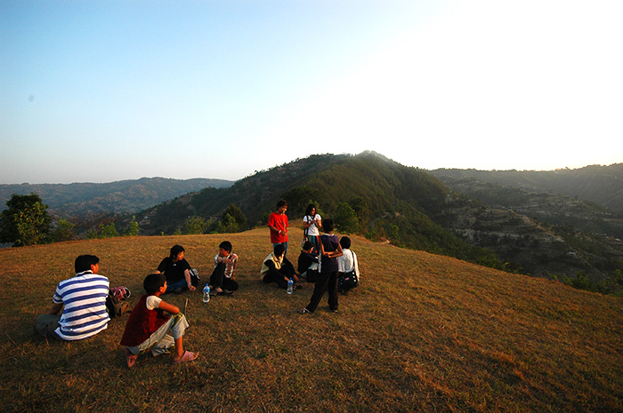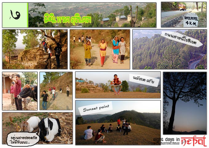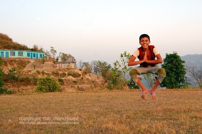 ระหว่างทางเดิน มองวิวเทือกเขาไปได้ตลอดทาง แม้ไม่เห็นหิมาลัยที่ปกคลุมไปด้วยหิมะ (เศร้า) แต่ก็เห็นเทือกเขาสลับซับซ้อนด้วยเงาของแดดอ่อนๆสวยชมัด ด้านล่างคือทุ่งราบกลางหุบเขา ขากลับได้พวกเพิ่มเป็นหนุ่มน้อย 2 คนเดินตามพวกเราไปตลอด ฝึกภาษาอังกฤษกัน จริงๆก็พูดเก่งแล้วทั้งคู่ เลยสอนภาษาไทยให้แทน เก่งแฮะ ออกเสียงได้ถูกด้วย เดินคุยกันไปตลอดทาง ไปคุยกับคนโน้นบ้าง คนนี้บ้าง ฮาไปเรื่อย เดินไปจนถึงเนินด้านหลังรีสอร์ท นั่งรอดูพระอาทิตย์ตกกัน บรรยากาศดีจริงๆ โม้กันจนพระอาทิตย์ลับเหลี่ยมเขาจึงร่ำลากัน