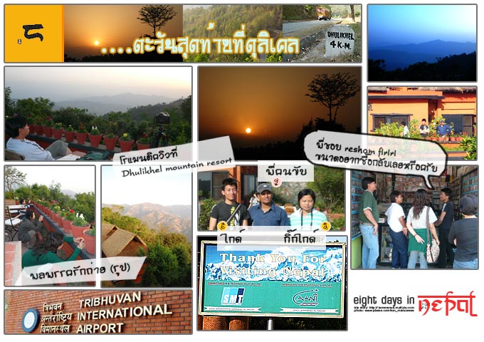 มื้อเย็นวันนี้ อารบินพาไปร้านอาหารไทยอีกร้านที่บอกว่าอร่อยกว่าร้านครัวไทยอีก เป็นร้านคนเนปาลแต่เคยทำร้านอาหารไทยมานาน ร้านนี้อยู่ย่านไฮโซเชียว อยู่บนดาดฟ้าของห้างตรงข้ามสำนักงานการบินไทยเลย บรรยากาศดีทีเดียวยิ่งไฟดับแล้วจุดเทียนยิ่งโรแมนติคใหญ่ นั่งรออาหารไปชมทิวเขาและพระอาทิตย์ตกได้มุมหนึ่ง อาหารอร่อยจริงหรือไม่ก็ไม่รู้เพราะไม่กล้ากินเลย มีคนป่วยเป็นเพื่อนอีก 1 คน อาการคล้ายๆกัน เลยไม่รู้ว่าเป็นเพราะไอติมจริงหรือเปล่าเพราะเขาไม่ได้กินไอติมด้วย แต่ทำไมอาการเหมือนกัน ตกลงได้แต่นั่งมองเพื่อนๆกินแกงเขียวหวาน หมูสะเต๊ะ ต้มข่าไก่ กันสองคนตาปริบๆ