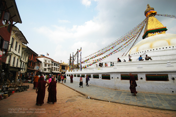 เจดีย์โพธินาถได้ชื่อว่าเป็นเจดีย์ที่ใหญ่สุดในเนปาล มีชาวธิเบตและชาวพุทธทั่วไปมาสักการะกันมากมาย แต่ละคนต่างเดินทักษิณาวัตรสวดภาวนาพร้อมหมุนกงล้อธรรมไปรอบฐานเจดีย์ นักท่องเที่ยวอย่างเรา เดินสักการะเสีย 1 รอบ แล้วขึ้นไปสัมผัสแบบใกล้ชิดด้านบนอีก 1 รอบ ก็พอแล้ว ลงมามองหาร้านกาแฟน่านั่งที่อยู่บนอาคารร้านค้าที่มีอยู่รายรอบเจดีย์ นั่งจิบกาแฟหามุมมองถ่ายภาพแปลกๆตา พร้อมมองดูผู้คนด้านล่างที่ยิ่งเย็นคนยิ่งเยอะ ทั้งมานั่งเล่นเดินเล่นมาสวดมนตร์เต็มไปทุกด้าน