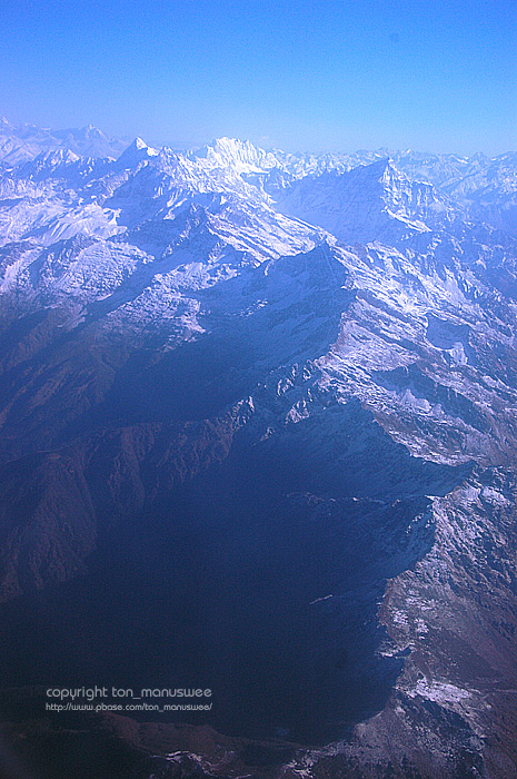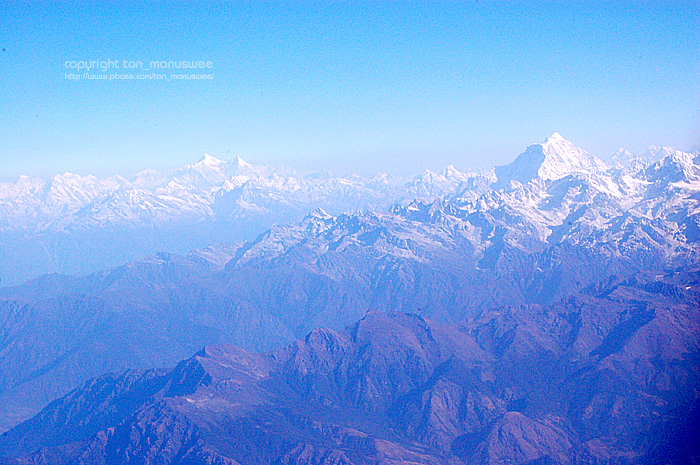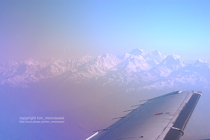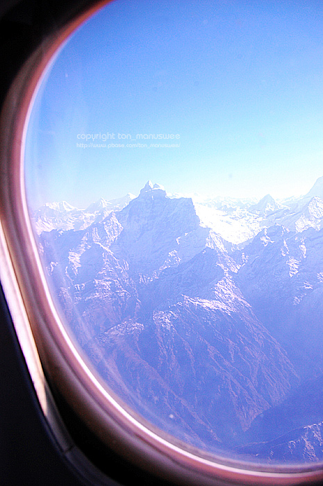 วันนี้ตื่นเต้นเป็นพิเศษเพราะเรามี mountain flight ชมหิมาลัย ต้องตื่นกันแต่ตีสี่ครึ่ง ออกไปรอขึ้นเครื่องที่สนามบิน มี 2 คนไม่ไป ก็ไปกันแค่ 4 คน อารบินไม่ได้เข้าไปด้วย ต้องไป check in กันเอง อารบินว่าไม่มีระบุเลขที่นั่ง แต่พอได้ boarding pass มันมีเบอร์นี่หว่าเห็นเลขกลางๆเครื่อง โอ้วววว ไม่เอาครับติดปีก ขอหน้าหรือหลังไปเลย พี่แกเลยเปลี่ยนให้เป็น 1A 1C 3A 3C ก็โอเค! รอแล้วรอเล่า ไม่มีป้าย ต้องคอยฟังเรียกเอา ฟังก็ไม่ค่อยรู้เรื่อง กว่าจะได้ขึ้นเครื่องก็เกือบเจ็ดโมง วันนี้มี mountain flight ออกตั้ง 3 ลำ เราได้ลำสุดท้าย เครื่องที่ใช้ก็เหมือนกับเครื่องที่บินกลับจากโพครานั่นแหละ เพียงแต่เขาขาย seat เฉพาะซ้ายขวาติดกระจก ที่นั่งของเรา 4 คนอยู่หน้าสุด ดีที่สุดในลำ ที่ 2A มันไม่มีกระจกเขาเลยเว้นไว้ 4-5-6 มันติดปีกพวกญี่ปุ่นได้ไป ขึ้นมานั่งร้องจ๊าก! ที่ด้านหลังถ่ายไปข้างหน้าก็ติดปีก ต้องถ่ายตรงๆกับย้อนหลัง พวกเราโชคดีไปที่ได้ที่ดี แต่กระจกมันไม่สะอาดเท่าไหร่เลย ในตั๋วเขียนว่า extra clear window แต่จริงๆเด็กเช็ดกระจกตามสี่แยกบ้านเรายังเช็ดสะอาดกว่า ที่ฝั่งซ้ายจะเห็นหิมาลัยก่อนแล้วค่อยวนกลับให้ฝั่งขวาเห็นบ้าง