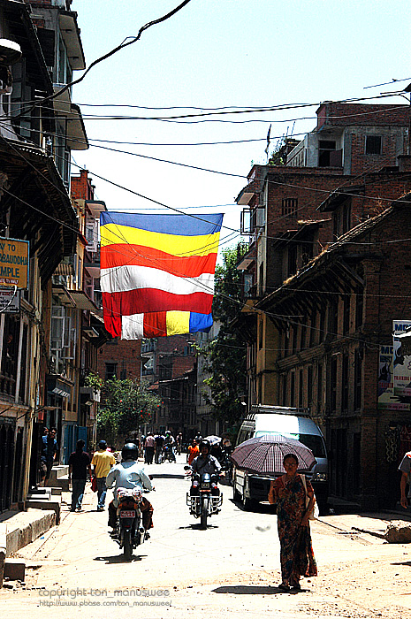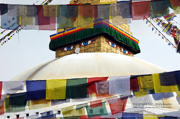 อารบินพาพวกเราไป check in โรงแรม nirvana ในย่านทาเมล แถบข้าวสารของกาฏมาณฑุ แล้วก็ออกเที่ยวกันเลย ที่แรกที่จะไปบ่ายนี้คือ วัดพุทธมหายาน วัดโพธินาถ (Boudhanath) นั่งรถผ่าเมืองไปทางตะวันออกไม่กี่นาทีก็ถึงแล้วแรกเดินผ่านซุ้มประตูเข้าไป ก็มองเห็นเจดีย์สีขาวหม่นทรงโอคว่ำอันใหญ่ ด้านบนมีดวงตาเห็นธรรม โตเหมาะสมกับขนาดของเจดีย์ ธงภาวนาหลากสีขึงระโยงระยางทั่วไปหมด เหมือนภาพที่เคยเห็นตามนิตยสารไม่ผิดเพี้ยน