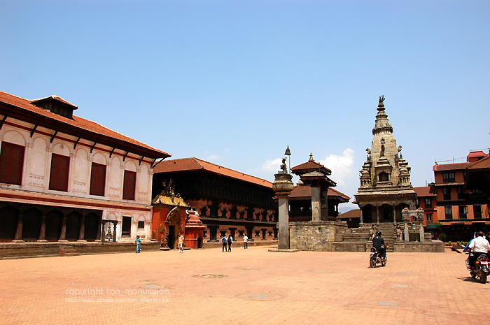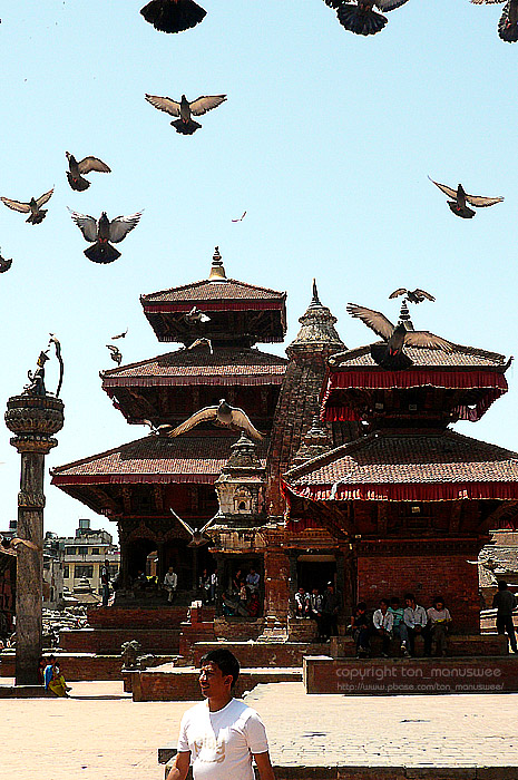 จากนี้เราจะไป กาฏมาณฑุดูบาร์ สแควร์ (Kathmandu Durbar Square) กัน รถย้อนกลับเข้ากลางเมือง ตัวเมืองวันนี้เต็มไปด้วยตำรวจพร้อมอาวุธยืนรักษาการณ์เต็มทุกแยก ดูๆไปชักหวั่นใจในสถานการณ์แฮะ แต่อารบินบอกว่าไม่มีอะไรพี่ ระหว่างทางผ่าน นารายัณหิตี ดูร์บาร์ (Narayanhity Durbar หรือ Narayanhiti Royal Palalace) ที่เคยเป็นพระราชวังหลวง ปัจจุบันเปิดเป็นพิพิธภัณฑ์เพราะเนปาลเพิ่งจะล้มเลิกระบอบกษัตริย์ไปเมื่อปีที่แล้วนี่เอง เลยไล่กษัตริย์ออกจากวังยึดมาทำพิพิธภัณฑ์ซะ รายละเอียดมันซับซ้อนขี้เกียจจะเล่า หวังว่าวันไหนมีเวลาเหลือจะมาเข้าชมให้ได้ รถผ่านต่อไปจนถึง New road ถนนสายหลักของเมือง ผ่านตุนทิเขล (Tundikhel) ดูคล้ายสนามหลวงบ้านเราไปถึงจุดลงรถท้องไส้เริ่มปั่นป่วนพะอืดพะอมบอกไม่ถูก สงสัยไอติมทำพิษ แต่ยังพอทนไหว เดินตามอารบินเข้าไปในดูบาร์สแควร์