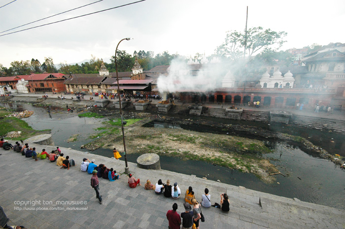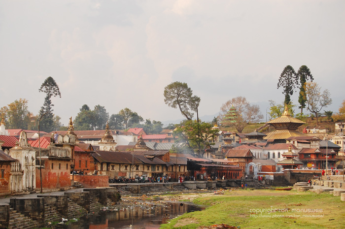 อิ่มแล้วเราไปปลงกันที่ วัดปศุปฏินาถ (Pashupatinath Temple) ริมแม่น้ำบัคมาตี แม่น้ำสายศักดิ์สิทธิ์ของเนปาล ตัววัดสร้างมาร่วมสามร้อยปีแล้ว ชาวเนปาลจะนำศพมาเผาที่เชิงตะกอนริมแม่น้ำ มีขั้นตอนและข้อกำหนดต่างๆหลายอย่าง มีแบ่งโซนของวรรณะกษัตริย์ วรรณะพราหมณ์และแพศย์ ส่วนพวกจัณฑาลก็ลงไปปลายๆแม่น้ำโน่น ด้านล่างของแม่น้ำจึงมีพวกจัณฑาลอยู่กันมากมาย เจอพวกเด็กๆและคนเดินขอเงินทั่วไปหมด
