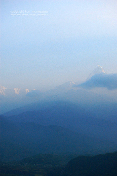 เหตุการณ์เหมือนเดจาวู ตีสี่ครึ่งตื่น พอตีห้าขึ้นรถไปซารังกอต เพียงแต่วันนี้ไม่มีฝน เช้านี้ด้านบนมีแต่ ไทย ฝรั่ง จีน ญี่ปุ่น วันนี้แขกหาย ต่างคนต่างจับจองมุมกันตามสะดวก เมฆยังเยอะ แต่พระอาทิตย์ก็ทำงาน แม้จะโดนเมฆบังไปบ้างก็ยังโผล่มาให้เห็น หิมาลัยเจ้าเอย….. พอมาให้เห็นเป็นช่วงๆ หางปลาเจ้าเอย…… โผล่มาอย่างรางๆเลือนๆ แค่นี้ก็ชื่นใจแล้ว แม้ไม่คุ้มเงินค่าเช่ารถเต็มร้อย แต่ก็ได้สัก 50% ล่ะน่า ได้แต่จินตนาการกันไปว่า ถ้าฟ้าเปิดมองเห็นวิวเทือกเขาอันนาปูรณะ (Annapurna I-IV) เห็นยอดหางปลา (Fish tail) ยาวต่อเนื่องกันรอบด้าน คงช็อคตายคาซารังก็อตเป็นแน่