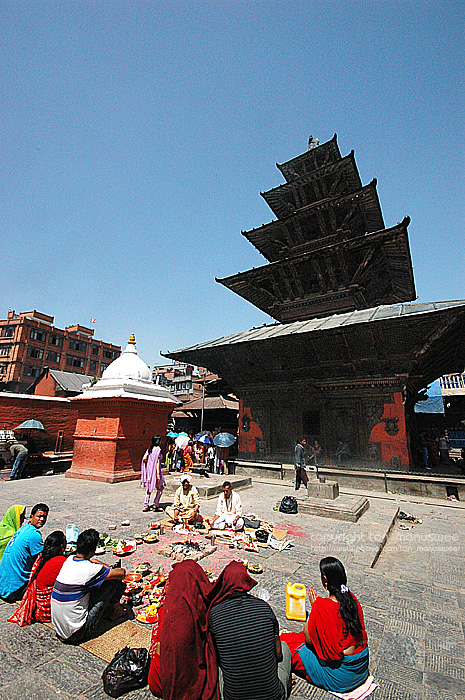 แล้วก็เดินย้อนกลับคราวนี้ผ่านไปทางลานหน้า วัดนยาตะโปลา (Nyatapola Temple) ที่ใครๆก็สั่งนักสั่งหนาว่าต้องขึ้นไปบน Nyatapola café ฝั่งตรงข้ามเพื่อถ่ายภาพมุมสูง แต่อารบินบอกว่าเรากินข้าวเที่ยงกันที่นี่เลยครับ แจ่มน่ะซิ ขึ้นไปชั้น 2 ของร้านเลือกนั่งที่ระเบียงรอบนอก โต๊ะเล็กๆแคบๆโต๊ะละ 2 คน นั่งกินอาหารไปมองดูผู้คนเคลื่อนไหวไหลไปมาด้านล่าง มองเห็นวัดนยาตะโปลา และวัดไภราพวนาถ (Bairapnath temple)ในมุมสูง บรรยากาศดีจริงๆ ส่วนอาหารก็แค่พอใช้ได้