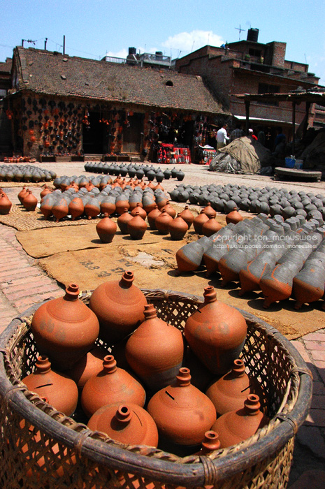 บ่ายๆ เราเดินเลยไปดูหมู่บ้านปั้นหม้อ อาชีพหลักแถบนี้คือปั้นเครื่องปั้นดินเผา จะเห็นหม้อ ไห โถ ดินเผา นำมาวางตากไว้เต็มลาน ใครถ่ายรูปชาวบ้านที่ปั้นหม้ออยู่ก็ดูให้ดี บางคนเขาคิดว่าถ่ายหนังเรื่อง Ghost อยู่ เพราะแกเล่นขอเงินค่าเป็นแบบซะงั้น ขากลับก็เดินชมเมือง ช๊อปปิ้งไปเรื่อยๆ กลับไปรถเพื่อกลับเข้ากาฏมาณฑุ แต่แรกอารบินอยากพาเราไปนอนที่ Dhulikhel คืนนี้ แต่เกิดเหตุการณ์ไม่ปกติ คือรถสิบล้อไปทับคนตาย ตำรวจเขาเลยปิดถนนไล่จับคนร้าย เลยไปไม่ได้ เอ้อ…เอากะเขาซิเนปาล