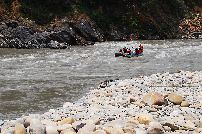 พี่บารัทคนขับรถตู้ของเราเรียกว่าชั้นเซียน เหยียบมาแค่ 2 ชั่วโมงก็ถึงจุดพักทานอาหารพอดีในเวลาเที่ยงกว่าเอง แวะทานอาหารกลางวันกึ่งจีนกึ่งเนปาลที่ Riverside spring resort ที่เมือง Kurintar รีสอร์ทน่าพักริมถนนไฮเวย์ จากห้องอาหารเดินลงไปริมแม่น้ำ Trishuli เห็นนักท่องเที่ยวมาล่องแก่ง (rafting) กัน อารบินบอกว่าเป็นกิจกรรมยอดนิยมแถบนี้ มีการแข่งขันกันเป็นเรื่องเป็นราวด้วยซ้ำ น้ำเชี่ยวใช้ได้ท่าทางจะสนุก แล้วก็ออกเดินทางต่อ จากนี้ทางก็ยังคดเคี้ยวไปเรื่อย อีก 2 ชั่วโมงกว่าก็มาถึงโพครา รวมแล้วพี่บารัทเหยียบไปแค่ 6.30 ชั่วโมง หักเวลาพักไป 1 ชั่วโมงเหลือแค่ 5.30 ชั่วโมงเอง !!!