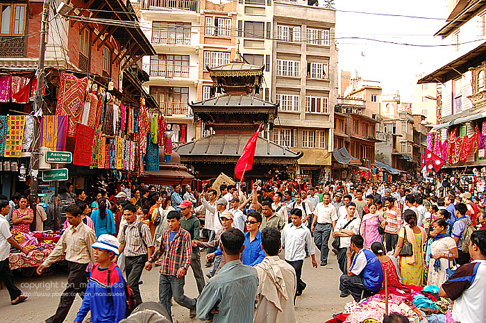 เราเดินกันไปเรื่อยๆ กำลังถ่ายรูปแม้ค้าขายผัก ได้ยินนกหวีดปรี๊ดๆๆ ลั่นถนน มองไปอีกทีเห็นตำรวจเดินมาเป็นขบวนแม่ค้ายกแผงขายของที่พื้นหลบกันจ้าละหวั่น นึกว่าเทศกิจมาซะอีก ที่ไหนได้หลังขบวนตำรวจเป็นขบวนประท้วงเดินกันมาเป็นแถวเป็นแนว โบกธง ตะโกนประท้วงกันให้ลั่นฟังไม่ออก การประท้วงที่เนปาลนี่คงมีบ่อยจนเป็นเรื่องปกติ คนประท้วงก็เดินไป แม่ค้าก็ขายของไป คนซื้อก็ซื้อไป นักท่องเที่ยวก็ดูไป เราสองคนเลยเดินตามขบวนเขาไปด้วย ถ่ายรูปไปเรื่อย ขบวนยาวน่าจะเป็นหลายพันคน เดินไปจนถึง Indra chawk ไม่ได้ไปต่อ คงต้องกลับแล้วเพราะมีนัดกินข้าวเย็นแถบทาเมล ขบวนก็ยังเดินต่อไปเข้า New road