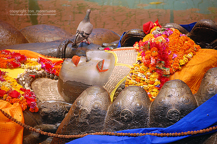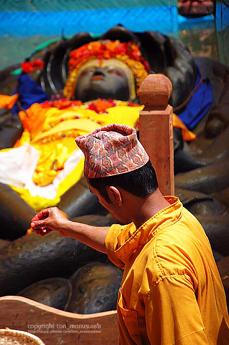 ลงจากเขามาก็เข้าร้านอาหาร (อีกแล้ว) มื้อนี้เป็นอาหารจีน เมนูเต็มโต๊ะเหมือนเคย หลังอาหารแวะเข้าซุปเปอร์มาเก็ตซื้อไอติมกระป๋องกินแก้ร้อน ไอติมรสวานิลาอร่อยมันดีใช้ได้แต่เหลวไปหน่อย จากนั้นอารบินพาออกนอกเมืองไปอีก เพื่อไป วัดพุทธนิลกัณฐะ (Budhanilkantha) วัดฮินดูชานเมืองที่มีรูปสลักหินพระวิษณุองค์ใหญ่นอนอยู่กลางบ่อน้ำโดยมีงูพันอยู่รอบองค์ ดูแล้วรู้สึกถึงความสวยงามและน่ากลัวไปพร้อมๆกัน บริเวณวัดมีผู้นับถือศาสนาฮินดูเข้ามาทำพิธีและสวดมนตร์กันเต็มไปหมด หลายคนลงไปทำพิธีกันริมบ่อน้ำเลยก็มี