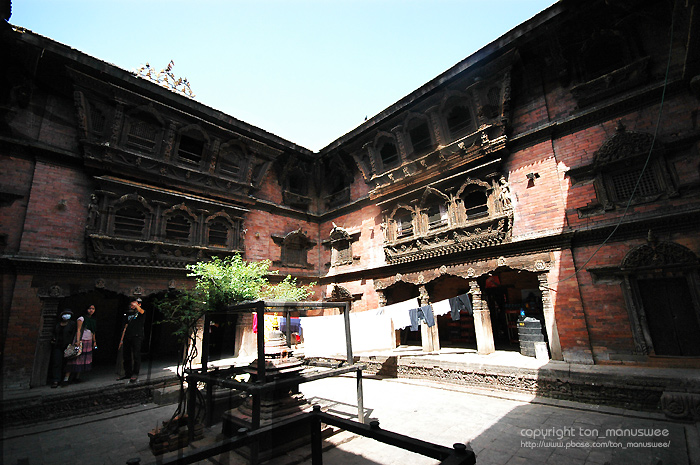ในเมื่อรถลากมาจอดแอ้งแม้งหน้าปากซอยบ้านอารบิน ก็ต้องเข้าไปเยี่ยมบ้านซะหน่อย จะได้ไปดูด้วยว่าอารบินโม้หรือเปล่าว่า “โอ๊ย…อยู่บ้านผมก็ดูได้ หิมาลัยเนี่ย” เดินเข้าตรอกไปไม่ลึกมาก ก็ถึงลานขนาดกลางๆ ล้อมรอบไปด้วยอาคาร 4-5 ชั้น หลายคนแอบมองพวกเราทางหน้าต่าง อารบินแนะนำญาติๆ นี่อา โน่นน้า เยอะแยะไปหมด คุณแม่ลงมาต้อนรับด้วย โอ้โห ยังสาวอยู่เลย แม่ยิ้มเขิน คงสงสัยว่าทัวร์อะไรเนี่ย มาเที่ยวบ้านไกด์ พวกเราบุกกันถึงห้องนอนอารบินที่อยู่ชั้น 5 สงบเงียบเรียบร้อย วิวดี ลมเย็น น่าอิจฉานัก ขึ้นบันไดไปอีกชั้นก็เป็นดาดฟ้า มองดูเมืองปาตันได้รอบๆ มองเห็นเทือกเขาหิมาลัยรางๆ ถ้าอากาศดีคงเห็นหิมาลัยตามที่โม้จริงๆแหละ นอกจากนั้นยังมองเห็นเจดีย์สวะยัมภูนาถลิบๆด้วยซ้ำ
